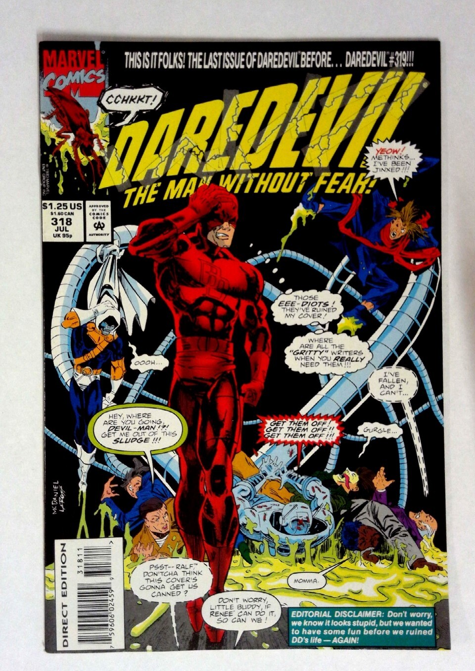 Daredevil #318 (1993) VF/NM Ralph Macchio Marvel Daredevil This issue features Daredevil in a whimsical storyline with editor Ralph Macchio and writer Renee Witterstaetter on the cover. The comedic commentary adds a unique layer to the classic Daredevil narrative. TITLE: Daredevil ISSUE: 318 GRADE: VF/NM SKU: VE-33-166Seller Information