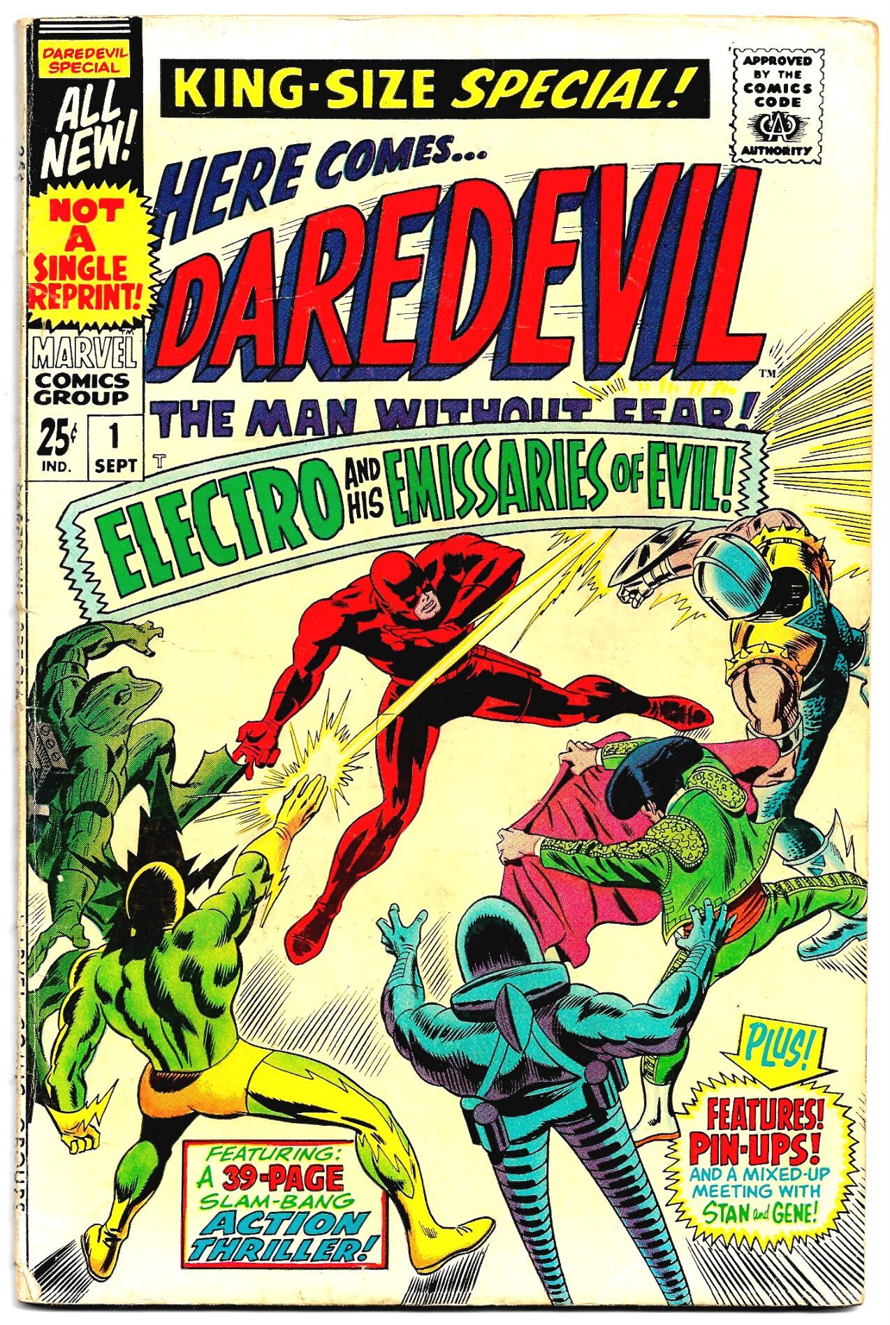 Here's the first of DAREDEVIL'S 10 Volume 1 Annuals . . and the first Marvel Annual to have all-new content rather than reprints in the first issue! And there's a little bit of something for everyone in its 68 pages - starting off with the 39-page story, "Electro and the Emissaries of Evil!" 'The Man Without Fear' goes up against a crazed Electro, simultaneously battling his malicious minions, Matador, Gladiator, Leap-Frog and Stilt Man!Also in this issue, showcasing outstanding art by Gene Colan, are features like "Inside Daredevil", "An Explanation" of Matt Murdock's twin brother Mike, "A Colorful Collection of DD's Cast of Characters!" featuring Karen Page, Foggy Nelson and Ka-Zar & Zabu, five pages of profiles of Daredevil's enemies, and a great 3-page story, "At the Stroke of Midnight!" that purports to be a humorous and zany story conference between Stan Lee and Gene Colan!