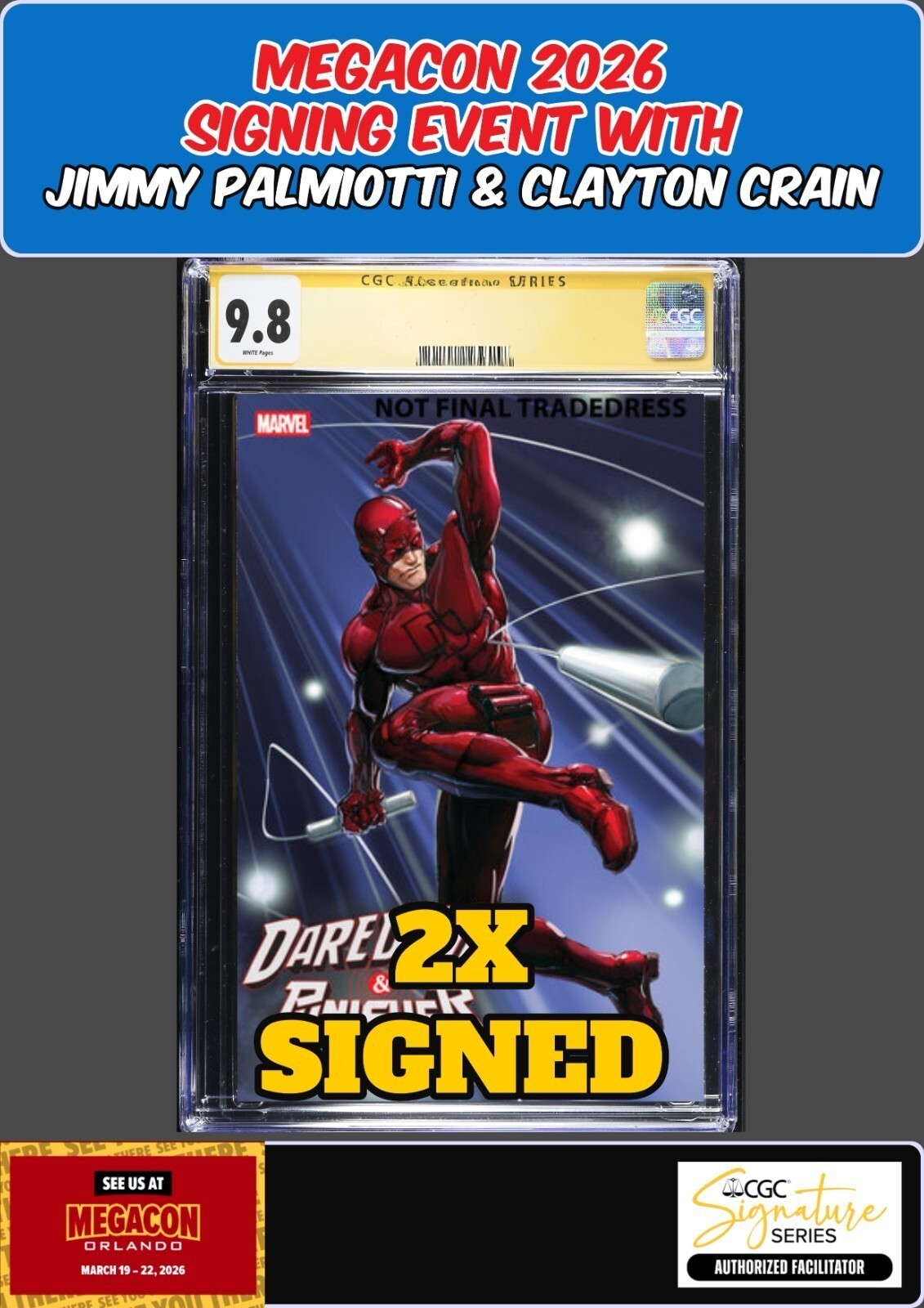 Grade: 9.8 Near Mint/Mint? Presale Announcement – Exclusive Signed & Graded Comic Book Be among the first to secure a premium collector’s piece from our upcoming event. At the MegaCon event, March 10-22, we will acquire a limited number of copies of the featured comic, personally signed by JIMMY PALMIOTTI & CLAYTON CRAIN, and then professionally graded to a guaranteed 9.8 grade.? What you are purchasing: A presale purchase for a comic book signed by JIMMY PALMIOTTI & CLAYTON CRAIN at the MegaCon event. After signing, the comic will be submitted to CGC and slabbed with a certified grade of 9.8 (Near Mint/Mint-Plus). Turnaround time: Up to 2 months after the event (i.e., grading submission, processing, return & shipping). You are paying now to reserve this exclusive piece — the physical item will be shipped once grading is complete. ✔ Why this listing is special: Guaranteed top grade: no “up to” guess; we promise the final slab will carry a 9.8 grade, or we will work with you to adjust accordingly. Signed at a major convention (MegaCon) with verification. Perfect for serious collectors seeking premium, investment-grade comics with provenance. Limited quantity: once the allocation is sold, we will close the presale. ? Important Terms & Conditions: You are purchasing the right to receive the final signed & graded comic book; shipping occurs after grading is complete and the slab has been returned to us — estimated turnaround is within 2 months after March 22. We will update you with tracking and grading slab photos once we receive the finished item. Because this is a presale, no immediate shipping upon purchase — please factor the wait time into your buying decision. Final grade guaranteed: if grading arrives at less than 9.8, you may choose a refund of your purchase price or accept the book at the lower grade with a pro-rated discount (we will agree terms ahead of time). Returns: Because of the custom nature of the item (signed plus grading), returns are only permitted under buyer protection policies or if the item is materially different than described. Payment must be completed at checkout; we will submit the book for signing during MegaCon and update you with progress.