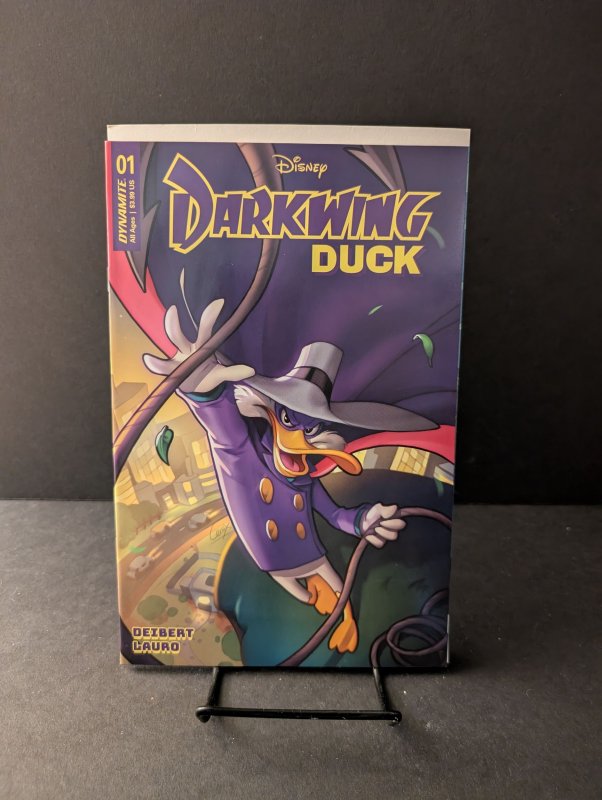 Written by Amanda Deibert. Art by Carlo Lauro. Cover by Leirix. He is the terror that flaps in the night…He is the ferocious fowl who plucks the evil eye from the face of foul play…He is Darkwing Duck! Alongside his trusty sidekick Lauchpad McQuack, Darkwing hyper-vigilantly defends St. Canard from the dastardly, devilish demons who would wage wanton war! By night, our caped defender lurks in the shadows, striking fear (and maybe confusion?) in the heart of the criminal underworld…but by day, no one suspects that Darkwing is also mild-mannered Drake Mallard, a well-meaning father to his adorable adopted daughter, Gosalyn! Can Darkwing successfully navigate his two separate lives, all while looking incredibly cool and impossibly handsome? (Hint: Probably not, but…) You'll have to read to find out! 32 pages, full color. Cover price $3.99.Seller Information