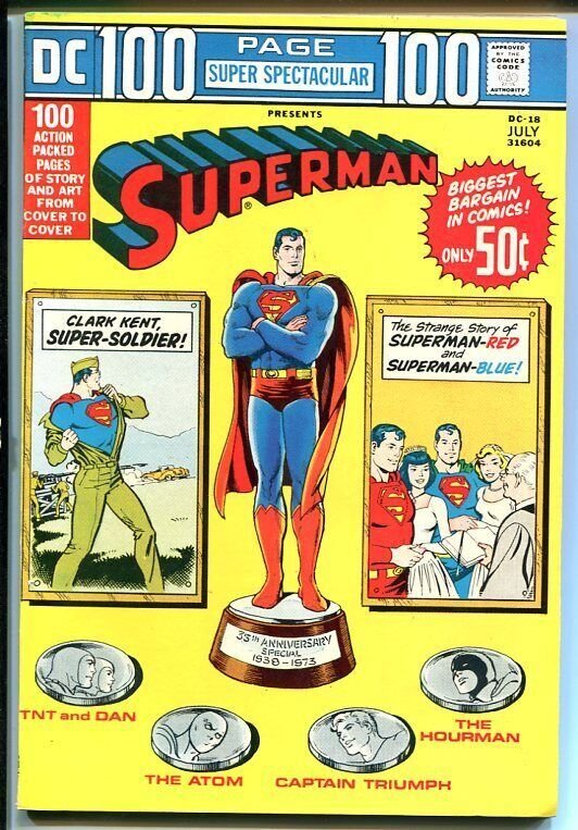 Dc 100-page super spectacular #18-superman-1973 hourman vf giant 100 page issue has golden age reprints of superman stories. Hourman, captain truimph, the atom, tnt & dan. 1973 grade: vf sku: con-dc-0230