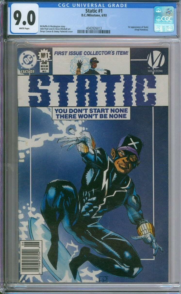 Static #1 CGC 9.0 DC / Milestone, 6/93White PagesArt CommentsMcDuffie & Washington storyJohn Paul Leon & Steve Mitchell artDenys Cowan & Jimmy Palmiotti coverKey Comments1st appearance of Static(Virgil Hawkins).Grad ... Read More