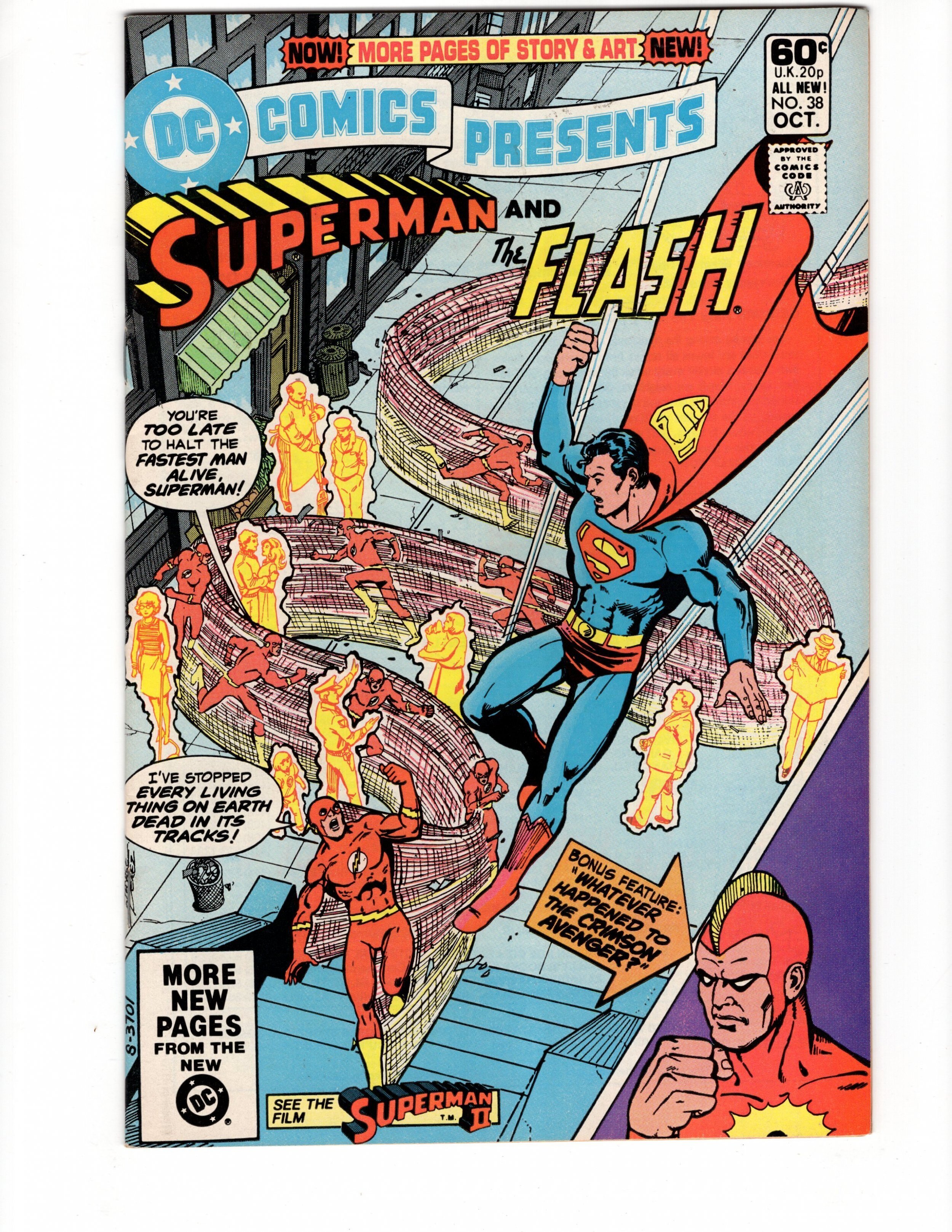 George Perez cover. Superman and the Flash team up to try to figure out why everyone and everything has decelerated to a much slower rate and look as if frozen in time in "Stop the World – I Want to Go Home!" Script by Martin Pasko and art by Don Heck. Issue also has a double page pinup of Superman and the co-stars from the first 36 issues of DC Comics Presents and "Whatever Happened to the Crimson Avenger." Script by Len Wein and art by Alex Saviuk & Dennis Jensen.