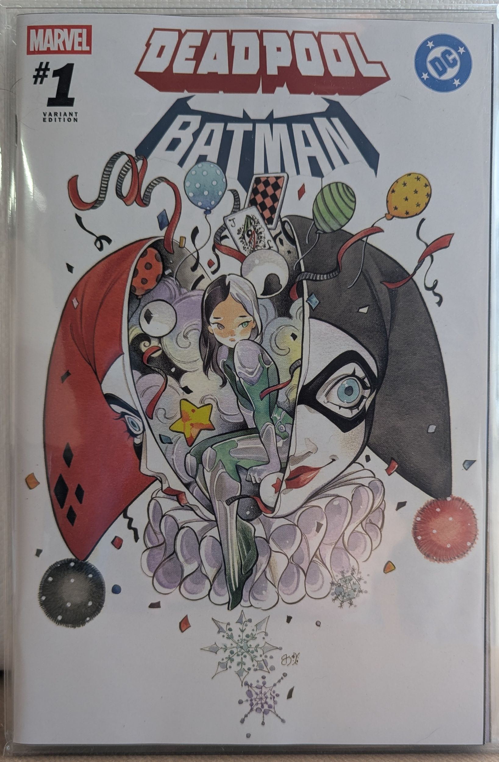 Marvel / DC: Deadpool / Batman crossover. The crossover you've pined for but never thought possible: DEADPOOL and BATMAN cross swords and batarangs as MARVEL and DC unite for the first time in decades!This edition is a Trinity Comics exclusive cover by Peach Momoko for NYCC 2025.
