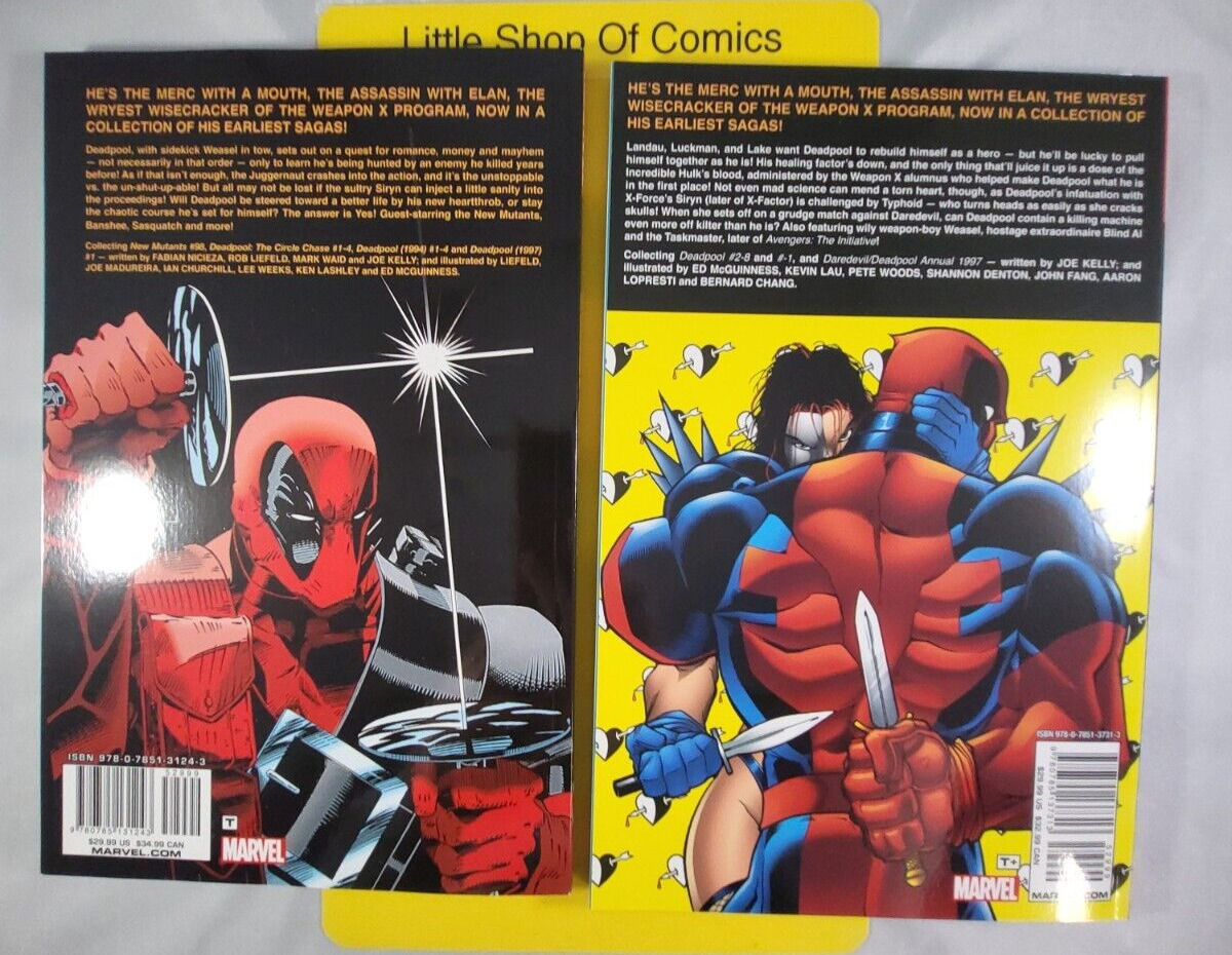 This listing is for Deadpool Classic Volume 1 and Volume 2 TPBVolume 1:New Mutants #98Circle ChaseSins of the PastDeadpool #1He's the Merc with a Mouth, the Assassin with Elan, the Wryest Wisecracker of the Weapon X Program, now in a collection of his earliest sagas, Deadpool, with sidekick Weasel in tow, sets out on a quest for romance, money, and mayhem - not necessarily in that order - only to learn he's being hunted by an enemy he killed years before! As if that isn't enough, the Juggernaut crashes into the action, and it's the unstoppable vs. the un-shut-up-able! But all may not be lost if the sultry Siryn can inject a little sanity into the proceedings. Will Deadpool be steered toward a better life by his new heartthrob, or stay the chaotic course he's set for himself? The answer is Yes! Guest-starring the New Mutants, Banshee, Sasquatch, and moreVolume 2: Contains Deadpool #2-#8Deadpool # -1Daredevil/Deadpool Annual 1997With his healing factor down, Deadpool takes a dose of the Incredible Hulk's blood and later finds his infatuation with X-Force's Siryn challenged by TyphoidPlease note this item will ship Media Mail which arrives slower!We do offer a priority service as well.Shelf wear on books. Local pick-up is on Thursdays from 11 am to 4 pm. Thank you for looking at our listing, this is how we make a living if you have any issues with your item(s) please get in touch with us first so we can help you with resolve that issue. Again, thank you for checking us out.Seller Information