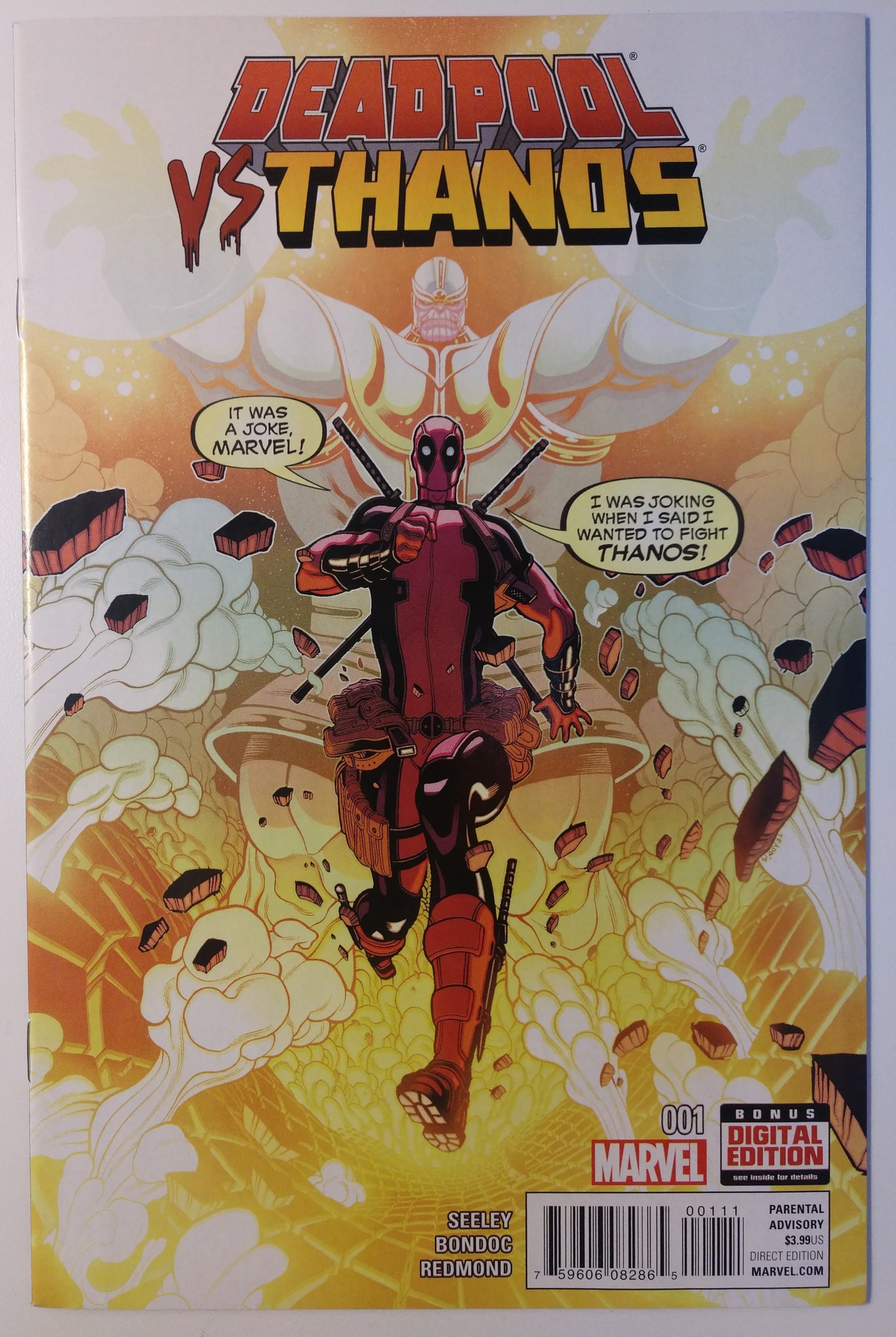 Deadpool vs. Thanos #1 (9.4, 2015). Our grading standards are based on the Overstreet Grading Guide with additional experience gained from our 20+ years in the comic industry. We are not professional graders and grading is arbitrary and there will always be small differences in opinion. Even professional grading services may not always receive the same grade if it is submitted for grading more than once. Please refer to the image or images for grading. Please ask for more pictures if you need to see a closer look. We will be more than happy to send more to you. We want to make sure you are happy with the book before you buy it.All our books are sent out on how we would like to receive them and knowing that it will make it without getting banged up. All item/s will ship out within 24-48 hours after the payment is received and cleared. All comics are shipped with USPS Ground. (Some orders will be free depending on the finished cost.)