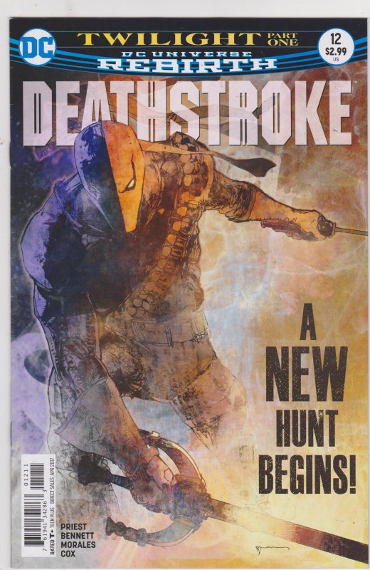 Deathstroke #12 by DC Comics copyright 2017. I have graded the comic book, using the Overstreet Grading Guide, at VERY FINE with the following defects: Light stress marks along the spine. The corners are rounded. The pages are showing light yellowing.Seller Information