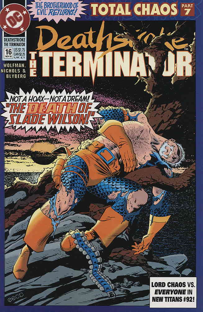 Item: Deathstroke the Terminator #16 | Publisher: DC | Cover Date: November 1992 | Writer: Marv Wolfman | Artist: Art Nichols | Cover Artist: Mike Zeck | Appearances: Deathstroke the Terminator | Storylines: Total Chaos, Part 7; Terminated: The Death of Slade Wilson | Notes: Death of Deathstroke the Terminator; Continued from Team Titans #2 & into New Titans #92 | With Economy shipping, each additional comic ships for just 50 cents more to customers in the USA. This listing contains a stock photo and information from ComicBase™ and © Human Computing. The stock photo is for reference only. If you would like to see a photo of the actual item, please message us prior to purchasing.Seller Information