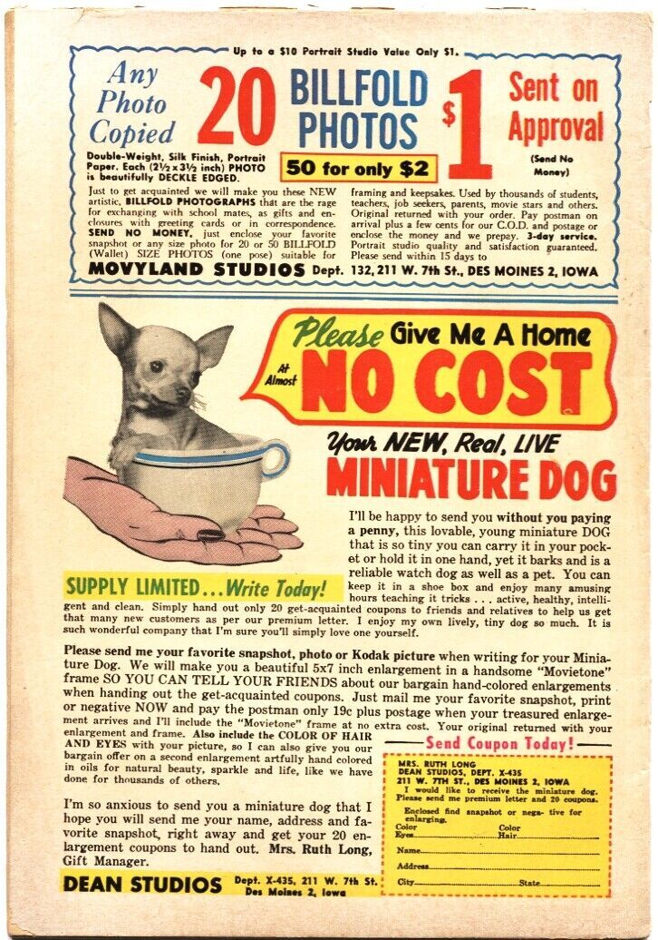 Detective Issue: 232 / Year: 1957 Condition: VG-Batman & Robin. -Early Manhunter from Mars story. -Flat, tight copy has small piece missing from spine near the top -This issue has the famous “dog in a tea cup” mail order ad on the back cover. Did anyone who answered this ad actually receive a small dog in the mail? Very bizarre concept. Publisher: DCSku: LI-102-026 Over 100,000 mail orders processed! Buy with confidence.