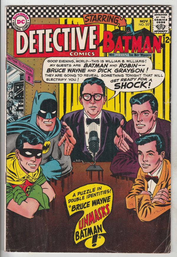 Detective Comics #357 - A Puzzle In Double Identities! "Bruce Wayne Unmasks Batman!" APPEARANCE - Elongated Man in yellow costume! ARTIST - Murphy Anderson on Elongated Man story! This book has a deep rich color o ... Read More