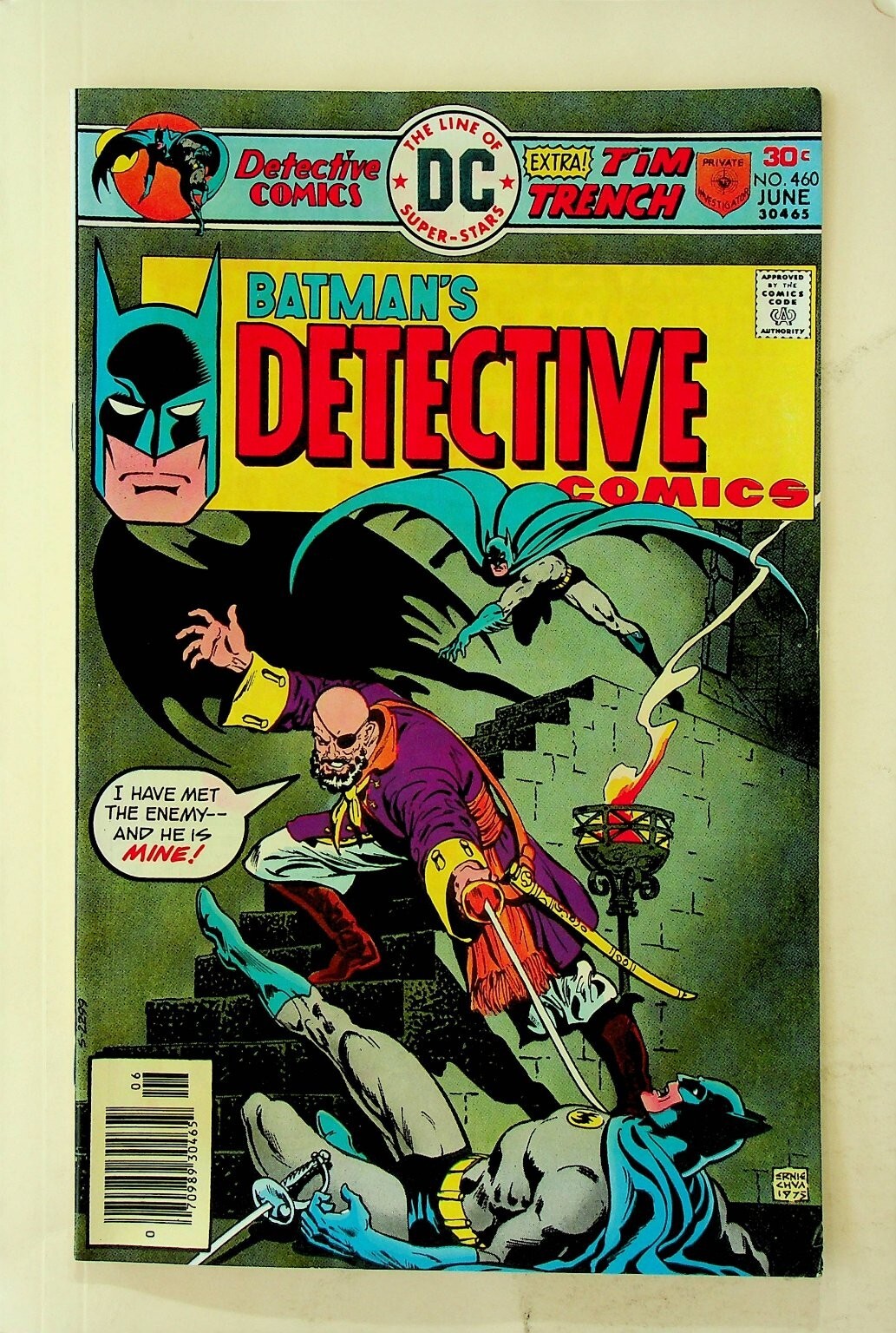 Grade: 8.0 Very FineThis is a single issue of Detective Comics #460 published by DC Comics in June 1976. This classic Bronze Age comic features Batman and includes an extra story with Tim Trench, as indicated on the cover. The cover price is 30c. This particular copy is a Newsstand Edition, identifiable by the UPC barcode on the front cover. The cover art is attributed to Irv Novick and features Batman in action against a formidable foe. This collectible comic book is a key piece for fans of vintage DC Comics and the Dark Knight. This listing includes one (1) comic book, as pictured.Verified specifications for this comic book include:Publisher: DC ComicsSeries Title: Detective ComicsIssue Number: #460Item Type: Comic BookEra: Bronze AgeFormat: Newsstand EditionCover Artist: Irv NovickKey Features: Tim Trench story, Newsstand EditionIncluded Components: 1x Comic BookLanguage: EnglishPublication Year: 1976Country/Region of Manufacture: United StatesCharacter: BatmanSuperhero Team: Batman FamilyGenre: SuperheroUnit Quantity: 1Unit Type: Comic BookUnit of Sale: Single Unit