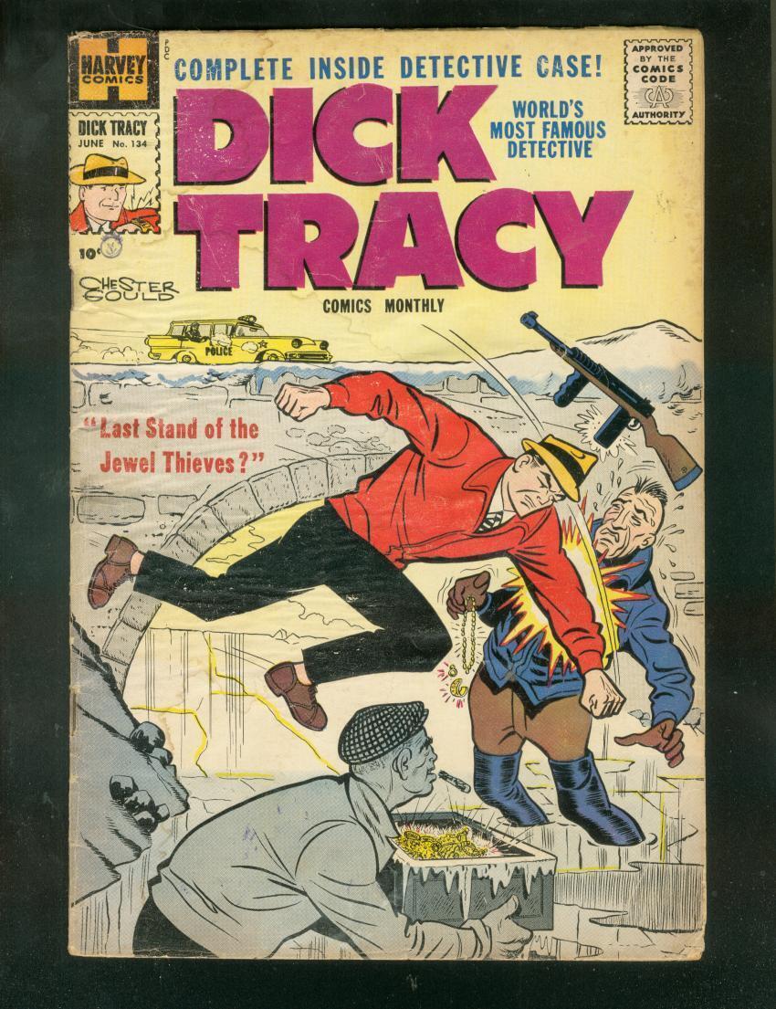 Dick tracy #134 1959-chester gould-harvey-cold crime! Fr featuring chester's gould legendary detective. Jewel thieves, note that tracy is not wearing socks on this cold weather cover! 1959 grade: fr sku: ds-03-015