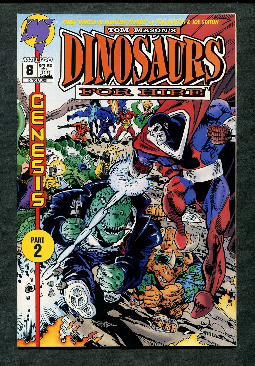 Not polybagged. Does not include pog. Cover art by Joe Staton. The Extinction Agenda (Part 2 of the Genesis Crossover), script by Tom Mason, pencils by Leonard Kirk, inks by Bruce McCorkindale; Dinosaurs die from food poisoning, and go to Hell; They are released after Gravestone (From the Protectors) makes a deal with Shakra. Dinosaur Highway Patrol, script by Tom Mason, pencils by Joe Staton, inks by Chuck Bordell; Dinosaurs for Hire as Highway Patrolmen.