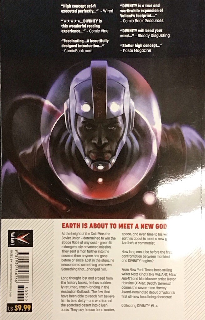 The product is the first printing of the trade paperback comic series "Divinity": Volume 1” published by Valiant Comics in 2015 and includes issues #1-4 of Divinity. Written by Matt Kindt and with artwork by Trevor ... Read More