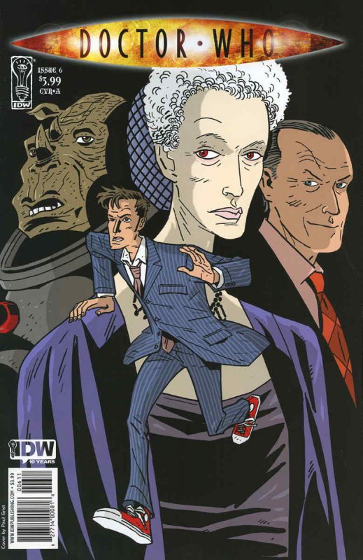 Item: Doctor Who (3rd Series) #6A | Publisher: IDW | Cover Date: December 2009 | Writer: Tony Lee | Artist: Matthew Dow Smith | Cover Artist: Paul Grist | Appearances: Advocate, Brarshak (Ogron), Doctor Who (10th Generation), Draconians, Mr. Finch, Kraden (Draconian), Matthew Finnegan, Judoon, Krillitane, Ogrons, Shadow Architect, Sontarans, Stomm (Sontaran), Emily Winter | Storylines: Fugitive, Part 4 | Notes: Cover A by Paul Grist | With Economy shipping, each additional comic ships for just 50 cents more to customers in the USA. This listing contains a stock photo and information from ComicBase™ and © Human Computing. The stock photo is for reference only. If you would like to see a photo of the actual item, please message us prior to purchasing.Seller Information