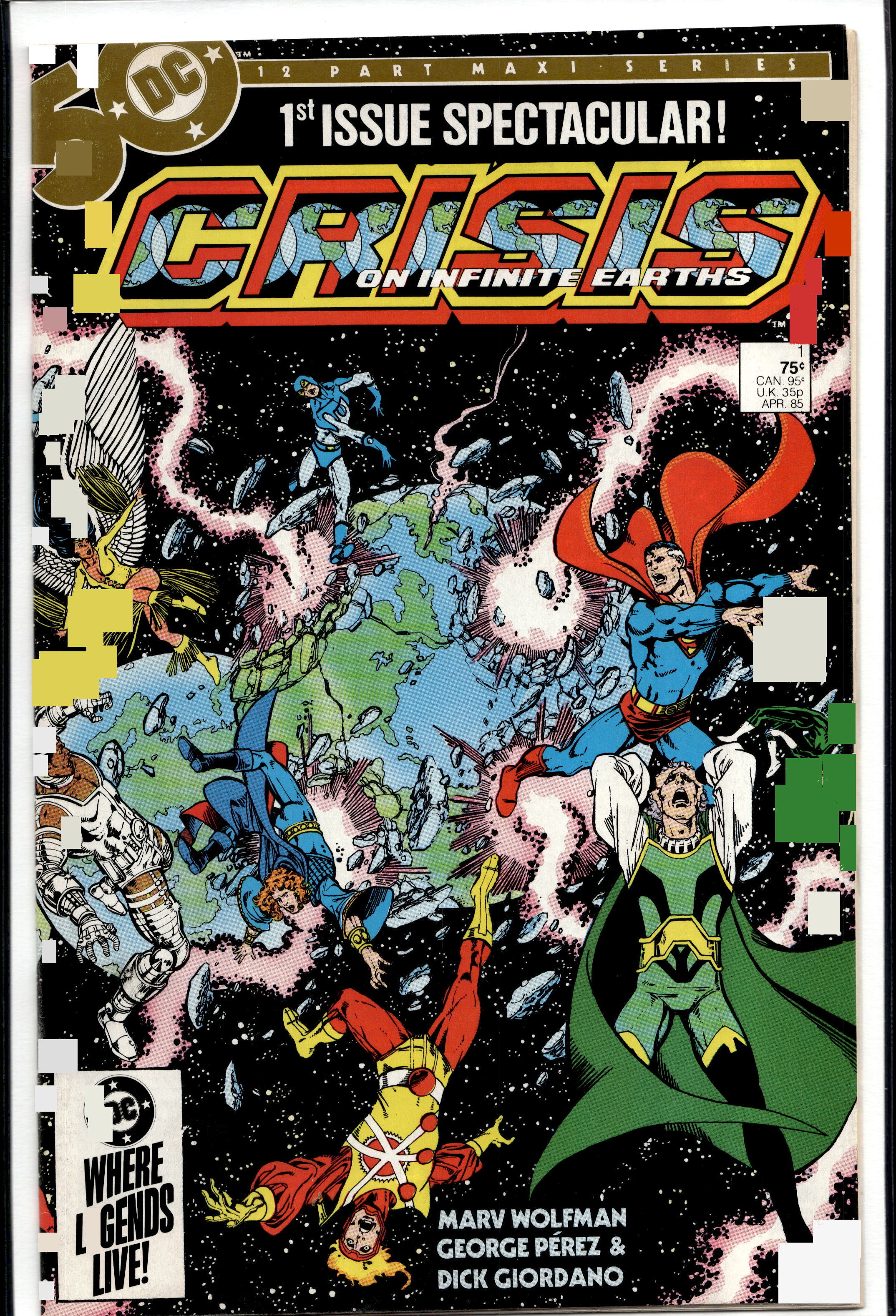 Dollar Comics: Crisis On Infinite Earths 95-Cent Cover (1985) First Appearance: Blue Beetle (Ted Kord) (in DCU), Pariah, Alex Luthor, Jr., The Monitor (full)