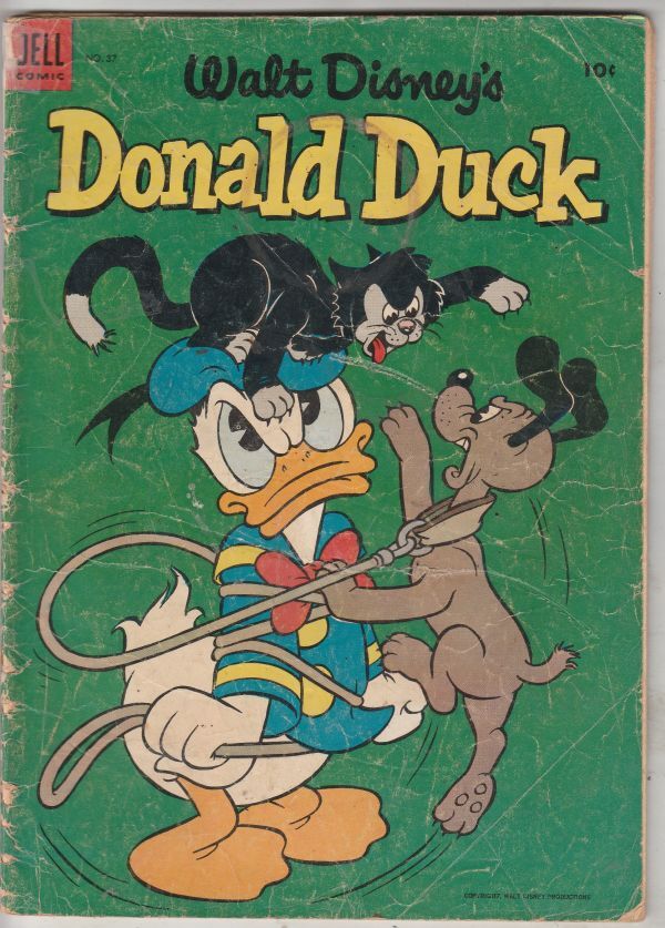 This book has deep rich color and decent eye-appeal on this all-time-classic Donald Duck with fighting cat and dog cover! With light wear appropriate to grade. The book is lightly attached at the spine and firmly attached at the center-fold with a rought spine. There is a tape-seal at the top of the spine.