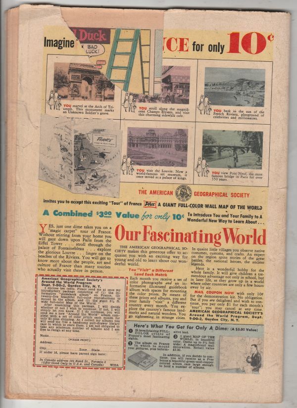 This book has deep rich color and decent eye-appeal on this all-time-classic Donald Duck driving accident cover! With a sizable chunk out at the top of the back cover and over-all light wear appropriate to grade. The book is well attached at the spine and the center-fold!