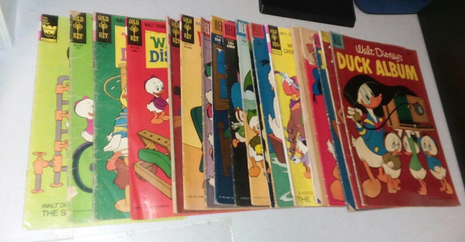 This listing is for a sweet copy of gold and silver and bronze age comics featuring Donald Duck Huey Dewey Louie and Uncle Scrooge many of them by Carl barks lot includes Walt Disney's duck album 840 Donald Duck 34 41 50 52 158 Uncle Scrooge 131 Walt Disney comics and stories 177 198 201 210 219 244 290 296 335 346 358 and 496 the Donald Duck numbers 50 and 52 both grade super low as they have major defects most of the rest I would call between 2.0 good and 4.0 very good out of 10 condition due to water damage bends tears or other defects.######add 3 items to your shopping cart and get 5$ off each when you pay for them as one order ##OFFER DOES NOT INCLUDE BEST OFFERSSeller Information