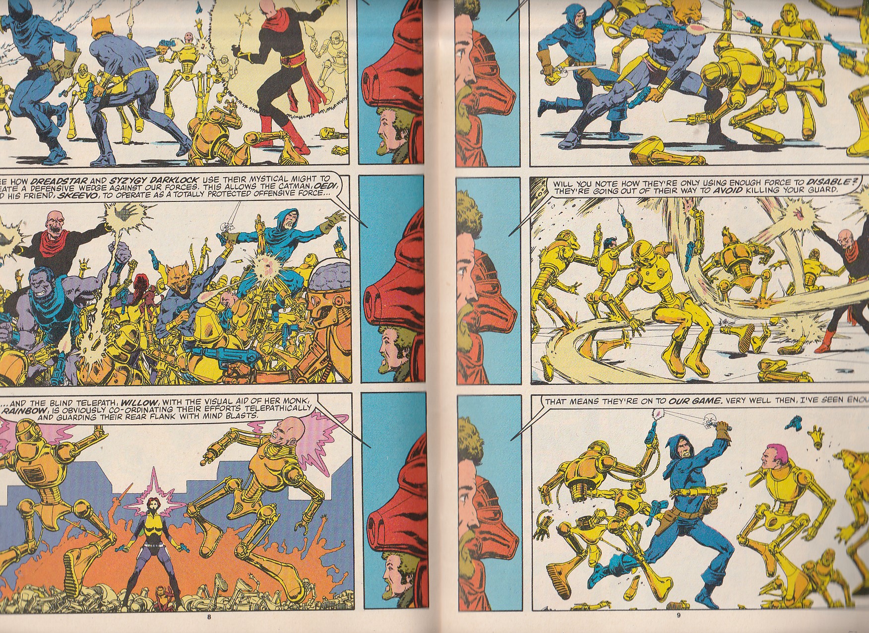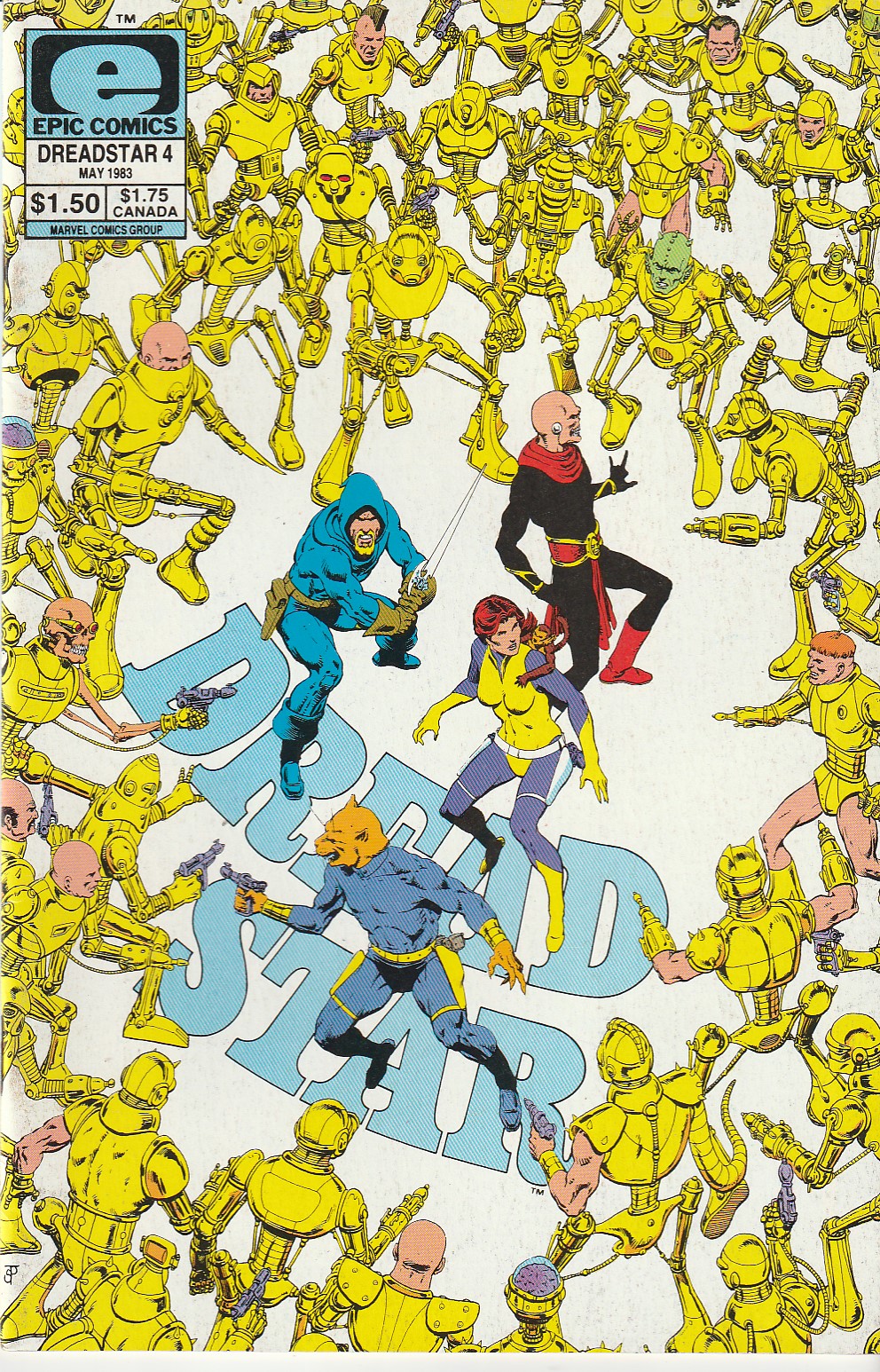 Dreadstar and his companions, the Cat Man, Oedi, The blind Cyberneticist, Willow, and the mage, Syzgy Darlock, fight the Instrumentality and its dark lord, The Lord Papal. Created, written, and drawn by Warlocl writer/Thanos creator, Jim Starlin.