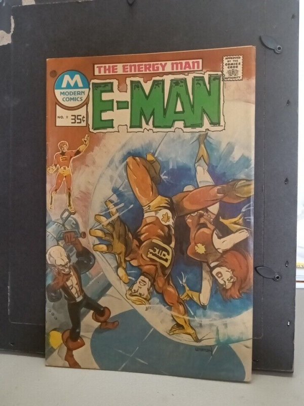 Grade: 7.5 Very Fine-This is an original copy of E-Man #9 from 1975, published by Charlton Comics. The issue features artwork by Joe Staton and contains the story "E-Man". The comic is in very fine- condition, graded 7.5. The series revolves around the character E-Man, a sentient energy being who is able to take on humanoid form. This particular issue is a great addition to any collection of US Comics, and would be a perfect gift for fans of the E-Man series or collectors of vintage comic books. Don't miss out on the opportunity to own a piece of comic book history!