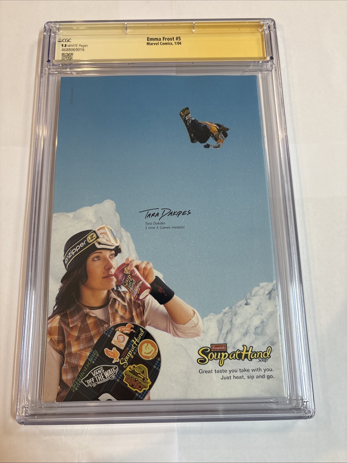Grade: 9.8 Near Mint/MintDive into the alluring world of Marvel's Emma Frost with issue #5, graced with the artistic touch of cover artist Greg Horn. This 2004 release is a must-have for fans and collectors alike, featuring the compelling character Emma Frost within the Modern Age of comics. The issue comes beautifully signed by Greg Horn, adding a personal touch of the cover artist's genius to your collection.Proudly published by Marvel Comics and evaluated by the Certified Collectible Comic (CGC) with an impressive grade of 9.8 Near Mint/Mint, this single issue comic promises prestige and quality. Embrace the legacy of US Comics tradition with this Emma Frost issue, a gem that seamlessly blends the artistry of Horn with the storytelling of Marvel's renowned Emma Frost series.