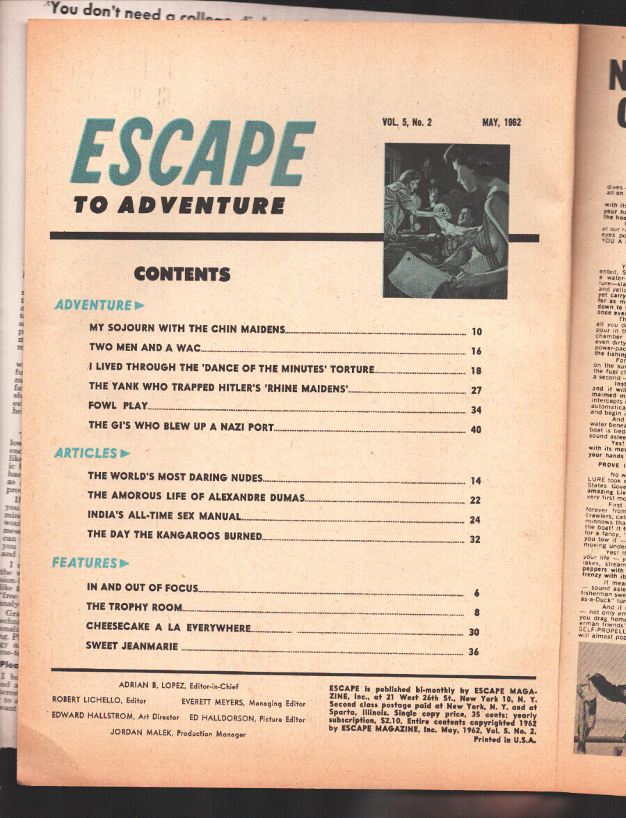Escape To Adventure Magazine 5/1962 -Alexandre Dumas -Alexandre Dumas, cheesecake and more. -Rare issue. -Cover detached from spine bottom 3.5". Grade: VG- SKU: EA-114-06