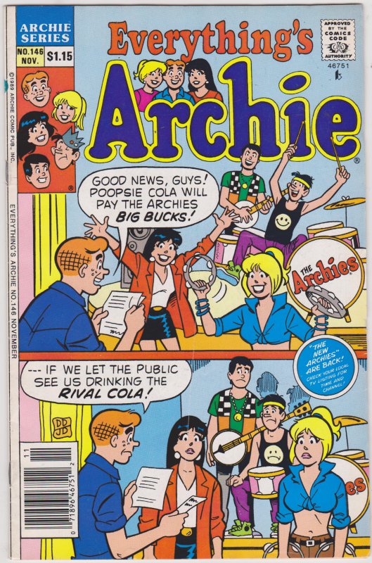 Everything's Archie #146 by Archie Comics copyright 1989. I have graded the comic book, using the Overstreet Grading Guide, at FINE with the following defects: Light stress marks along the spine The spine is rolled. The corners are rounded. There is yellowing of the pages.Seller Information