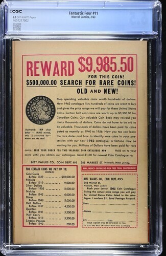Grade: 6.5 Fine+ Fantastic Four #11 CGC 6.5.You will receive exactly what is pictured in the listing. Items will be shipped extremely carefully to insure they arrive in excellent condition.All S/H for this auction ... Read More