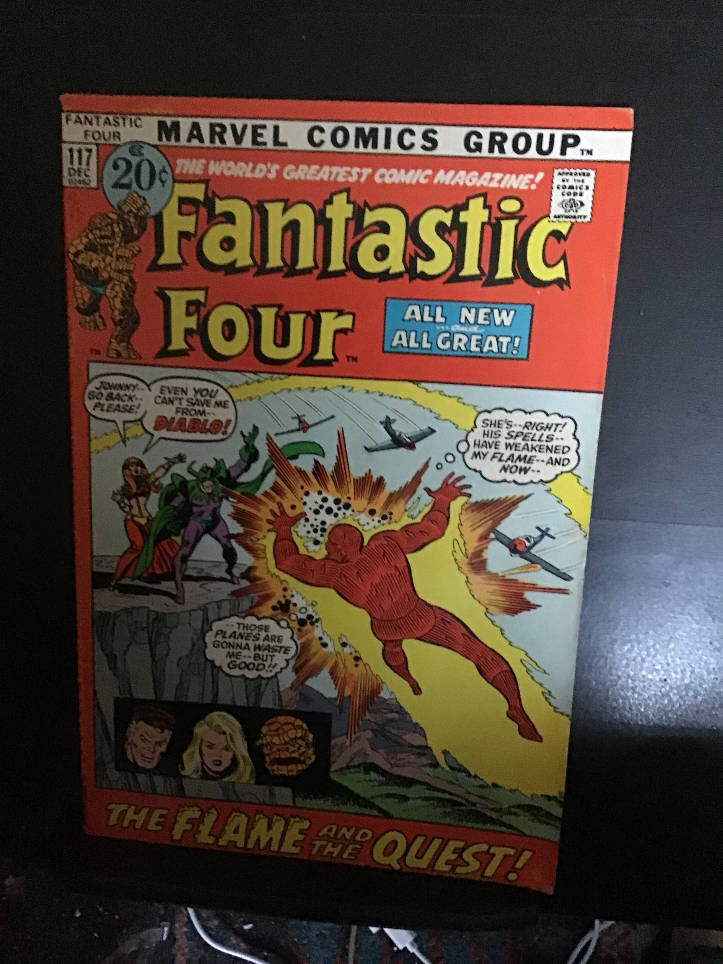 Fantastic Four #117 (1971) with nice rich color and eye-appeal on this all time classic Diablo and Crystal, fantastic four cover! With cream/very slight Heavy cream tint pages and white inside covers. The book is well attached at the spine and the centerfold. With Small thin tape seal at the outer edge of the inside front cover. With A small circles arrival date at the top of page one, along with a black magic marker small rectangle at the base of the Backpage and light wear appropriate to grade. We have adjusted the grade accordingly Or the page quality..Seller Information