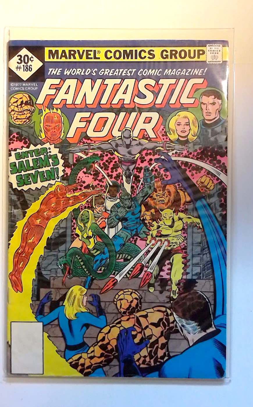 View All ListingsSee FeedbackAdd to Favorite SellersDESCRIPTIONFantastic Four #186 Marvel Comics 1977 6.0 FN Fine Condition Bronze Age Comic Book Whitman Variant 1st PrintingFantastic Four #186 (1977) "Enter: Salem's Seven!" Written by Len Wein. Pencils by George Perez. Inks by Joe Sinnott. Cover by George Perez and Joe Sinnott. The Fantastic Four faces three daunting tasks! First, stop the planned execution of Agatha Harkness; second, find and rescue Franklin; and third, defeat a new group of super villains...the Salem Seven! How will the FF match up against Brutacus, Gazelle, Hydron, Reptilla, Thornn, Vakume, and Vertigo? Hopefully, it's favorable; otherwise everything will be lost!. Cameo appearance by the Impossible Man. Notes: Nicholas Scratch and the Salem Seven return in Fantastic Four Annual 14. The letters page contains a letter from comics writer Kurt Busiek. A 35-cent cover price variant exists for this issue. First appearance of the Salem Seven.Increase your comic book collection and enjoy this comic book featuring Marvel Comics' Fantastic Four with Mr. Fantastic, Invisible Woman, Thing, Human Torch.Our newer comic books for sale are usually* high grade, unread, mostly flat, and glossy back stock. See the listing image(s) to get a better evaluation of the condition. Grading, if provided, is of our personal opinion.COMBINED SHIPPING PROMOTIONAnd to Cart and Pay shipping only once*. Flat rate shipping cost for multiple item orders.*Highest shipping rate is applied to the order. *Exclusions apply - CGC/Slabbed books ship at a higher tier so the cost is only reduced.BEST OFFER ACCEPTEDOffers are excluded from promotional discounts since they represent your requested cost for purchase. Combined shipping can be expected but may not be applied automatically if you checkout offers/items separately.SHIPPING DETAILSOrders ships out the same or next business day. The average shipping delivery time range from 2 to 7 days. Shipped using economy options which is usually USPS Ground Advantage.PAYMENT DETAILSPay with Google Pay, PayPal, PayPal Credit, debit card, or most credit cards.FREE RETURNS30 days money back guaranteed. Returns accepted and shipping will be paid by the seller.Check Out Our Other ListingsHip Store:Cosmic-King©2024 cosmic-king. All Rights Reserved.