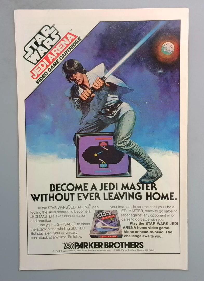 A vintage advertisement for the Star Wars: Jedi Arena video game cartridge by Parker Brothers is included as a period piece, reflecting early 1980s gaming culture and cross-promotional marketing common in comics of this era.