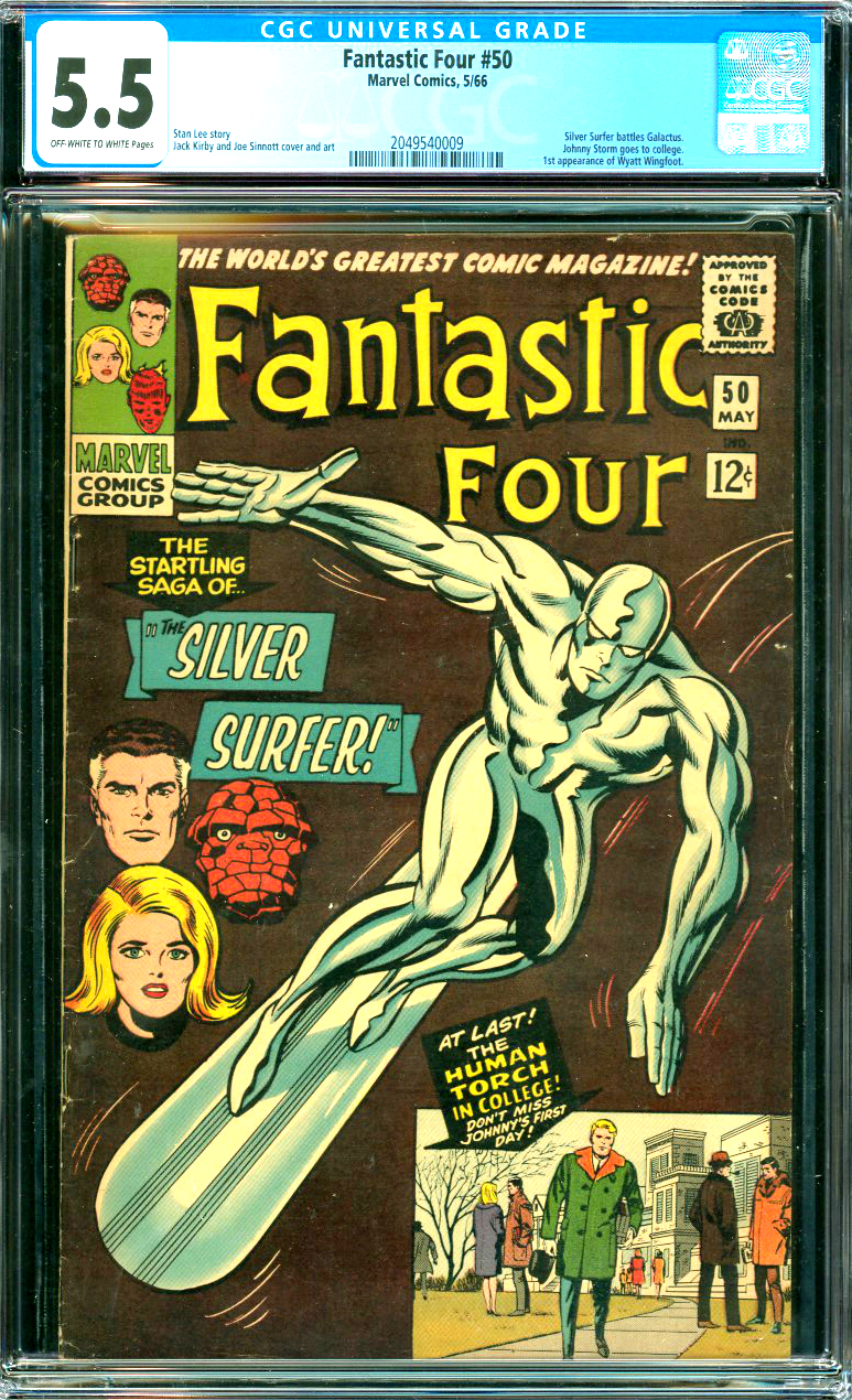 Fantastic Four #50 CGC Graded 5.5 Silver Sufer battles Galactus. Johnny Storm goes to college. 1st appearance of Wyatt Wingfoot.