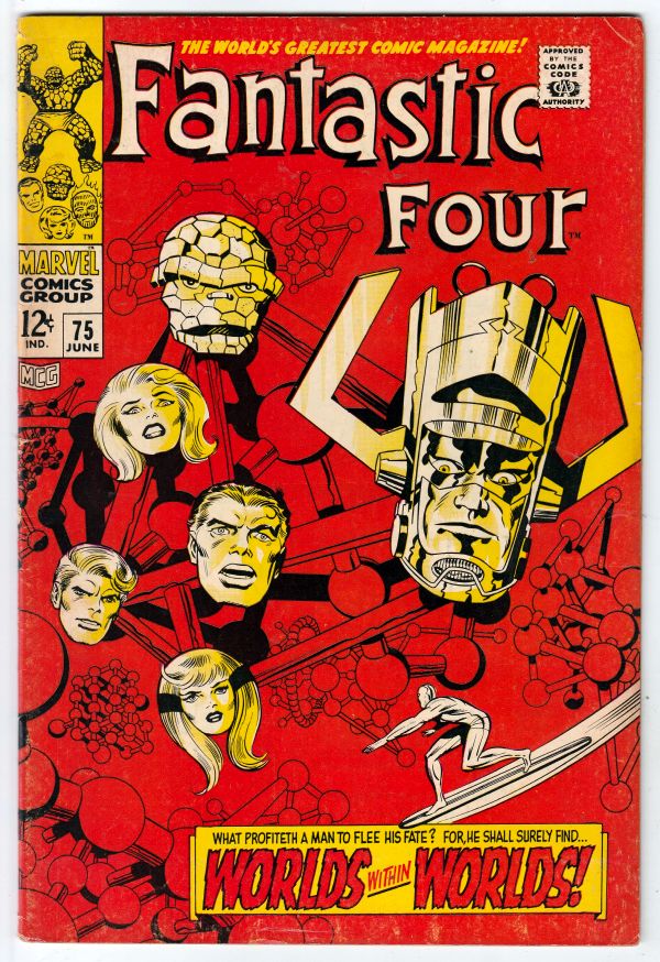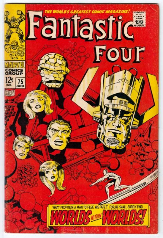 Fantastic Four #75 - Worlds Within Worlds! APPEARANCE - The Silver Surfer Cover story APPEARANCE - Galactus This book has deep rich red all-time-classic Galactus and Surfer cover! There is an upper-outer tip-creas ... Read More