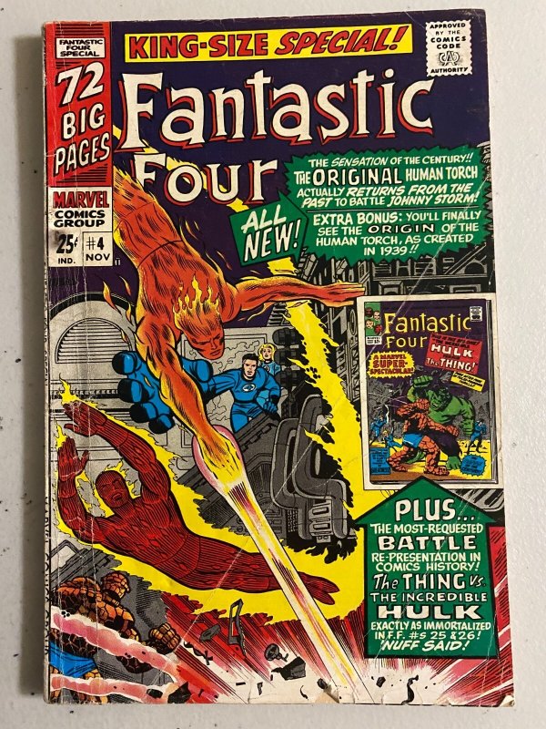 Fantastic Four Annual #4 (1966). 3.5 VG-, multiple cover folds.Please be sure to check our other exciting listings. Lot buyers: quantity of books (as described in item title and shown in photos). Unless an item description says SET or RUN it does not contain all consecutive books. Some items say VARIANTS so some variant covers are included which are duplicate issues in the storyline. With over 40 years of experience we expertly and professionally pack and ship your order maximizing item protection. Shipping is $5.99 for singles. We can ship up to four singles with combined shipping. For lots each 50 books is $14.99 per box. Shipments may also be expedited for an extra charge if you contact us first. Otherwise all orders ship within 2 business days, usually next business day. Satisfaction Guaranteed:If you do not feel you have received good value for your money, we offer free returns.