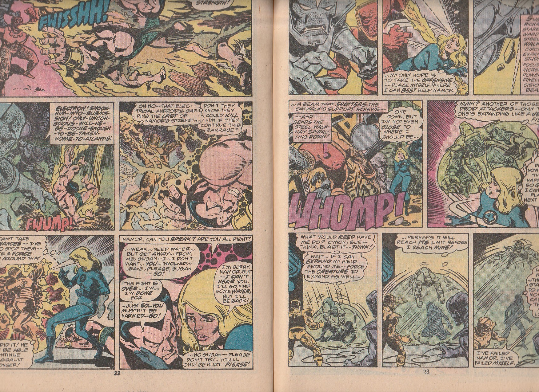 The Fantastic Four is no more, leaving Sue Richards, The Invisiblle Woman, open to a liaison with Prince Namor, The Sub Mariner. However, the tryst is interrupted by a band of savage aquatics, The Rampaging Retrievers ! Crisis On Infinite Earths/New teen Titans writer, Marv Wolfman provides story while Thor artist, Keith Pollard, and Star Trek The Next Generation artist, Pablo Marcos, provide art. Crisis On Infinite Earths/New teen Titans/Avengers artist, George Perez and Avengers/Fantastic Four artist, Joe Sinnott provide cover art