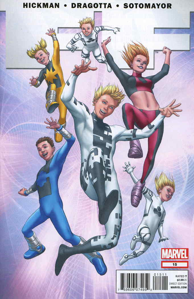 Item: FF #15 | Publisher: Marvel | Cover Date: April 2012 | Writer: Jonathan Hickman | Artist: Nick Dragotta | Cover Artist: Mike Choi | Appearances: Celestials, Doctor Doom (Kristoff Vernard), Future Foundation, Artie, Dragon Man, Invisible Woman, Korr, Leech, Mik, Mister Fantastic, Franklin Richards, Nathaniel Richards, Valeria Richards, Spider-Man, Thing, Thirty-Two, Tong, Turg, Vii, Wu, Zero G, Human Torch, Moloids, Power Pack, Energizer, Lightspeed, Mass Master | Storylines: The One Where Power Pack Shows Up | With Economy shipping, each additional comic ships for just 50 cents more to customers in the USA. This listing contains a stock photo and information from ComicBase™ and © Human Computing. The stock photo is for reference only. If you would like to see a photo of the actual item, please message us prior to purchasing.Seller Information