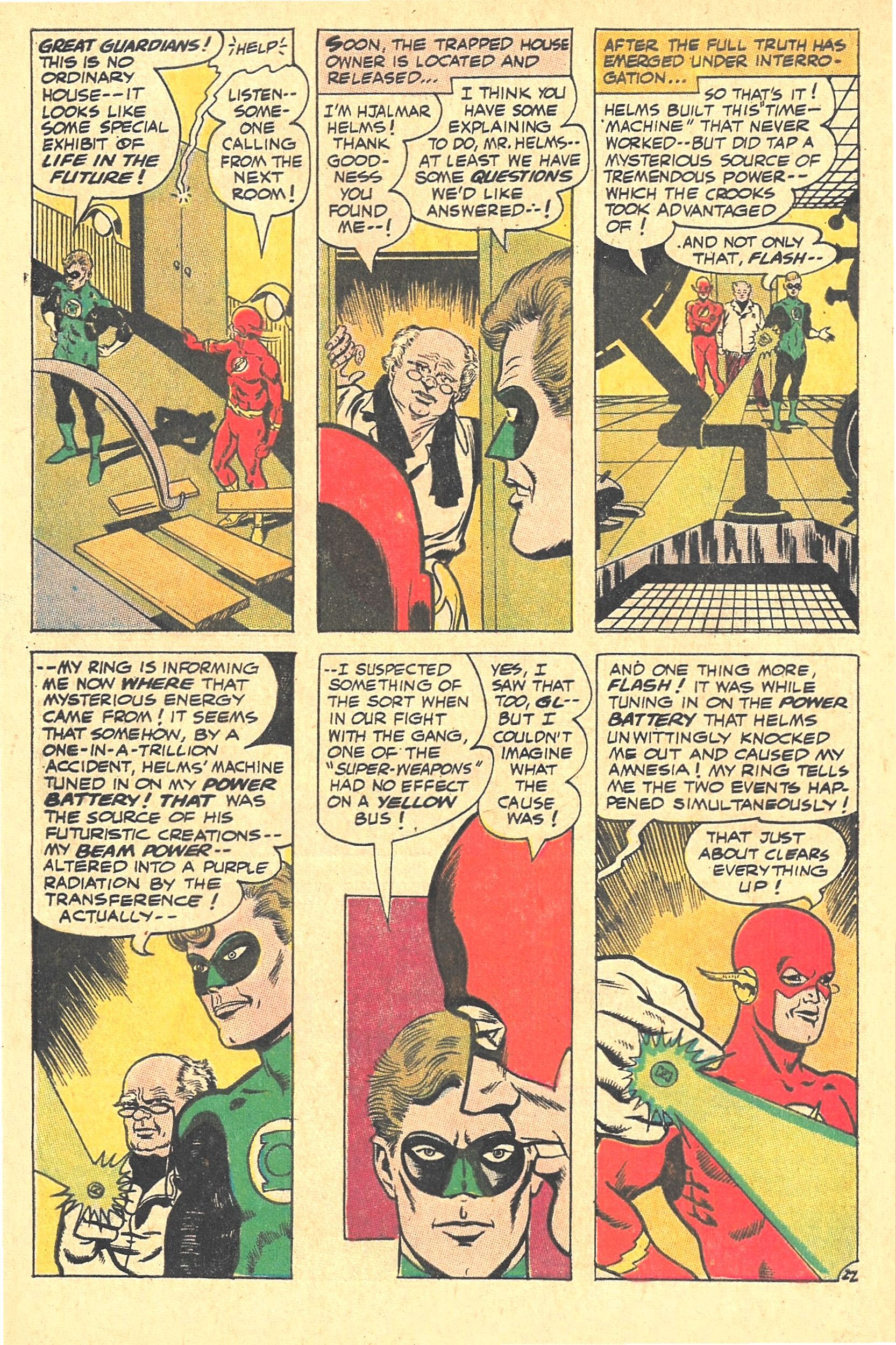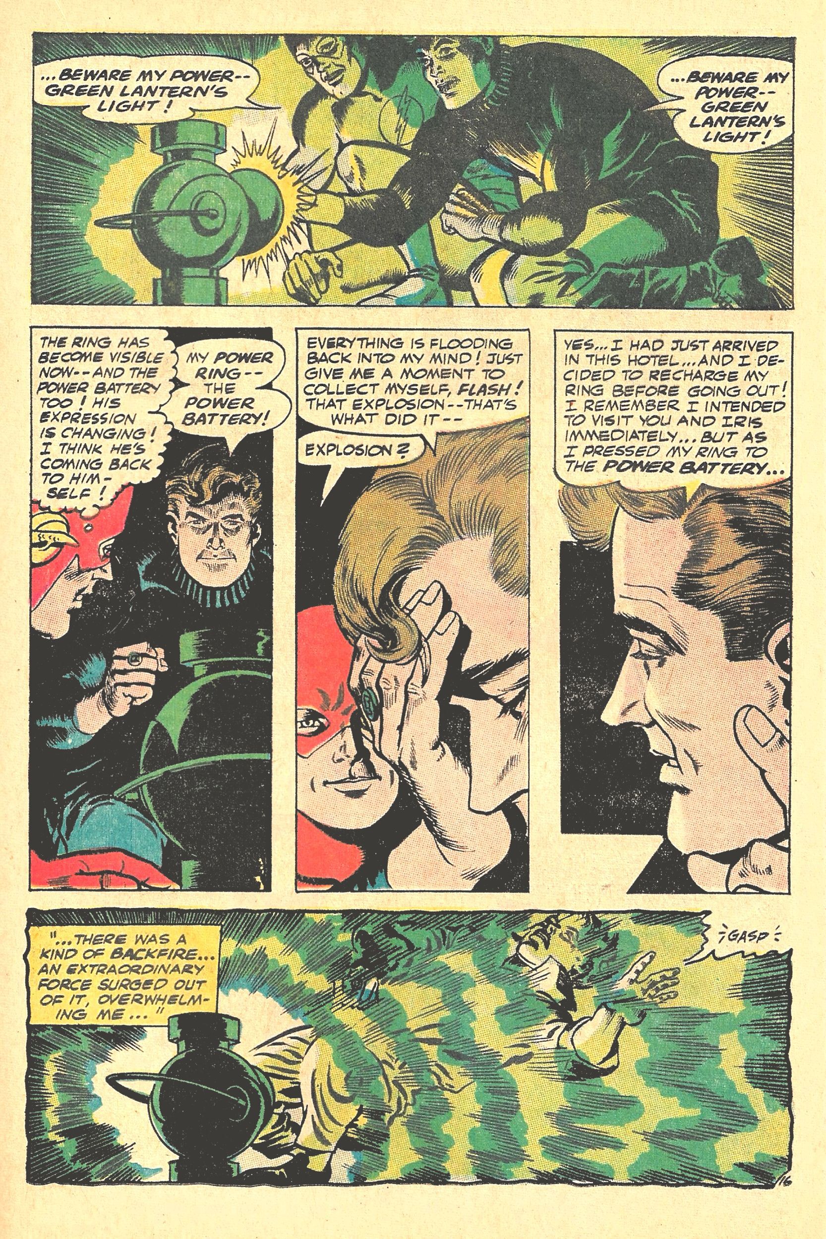 The history of DC COMICS is filled with iconic and unique partnerships. But the one that has endured every retcon and every new character is the bond between the FLASH and GREEN LANTERN. Both characters can trace their famous lineages back to the Golden Age, and each one has evolved with the passage of time.Here is the THIRD APPEARANCE of both the EMERALD GUARDIAN and the SCARLET SPEEDSTER together in THE FLASH - a friendly dynamic that FIRST took place between the Silver Age FLASH (Barry Allen) and GL (Hal Jordan) in GREEN LANTERN #13, from June 1962 . . and the first superhero pair to learn each other's Secret Identities!