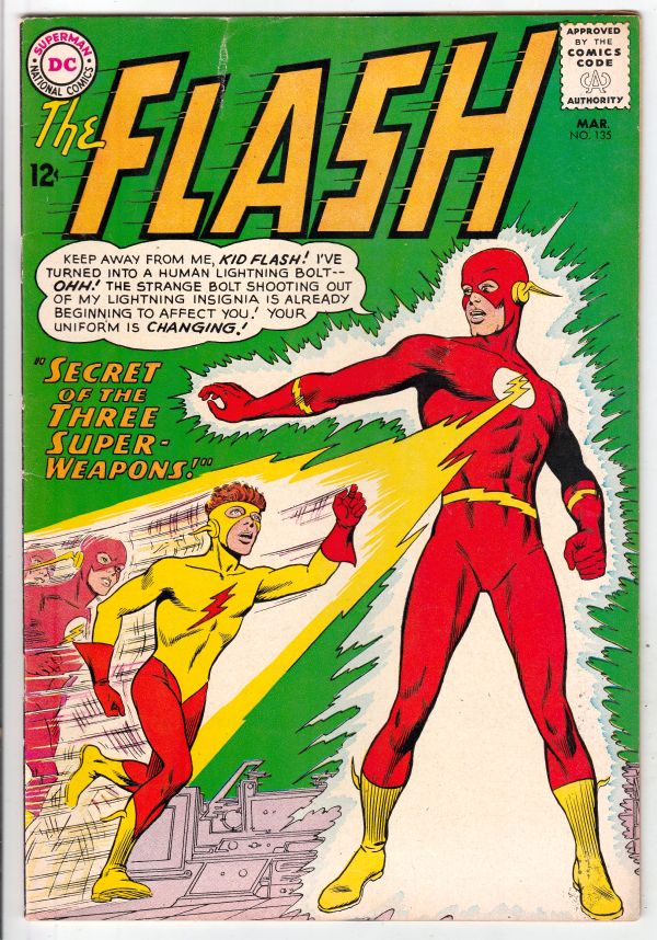 Flash, The #135 - "Secret Of The Three Super Weapons!" COVER - 1st Kid Flash in new costume! ARTIST - Carmine Infantino! This book has very nice eye-appeal with just a scratch a the top-edge of the front cover abo ... Read More