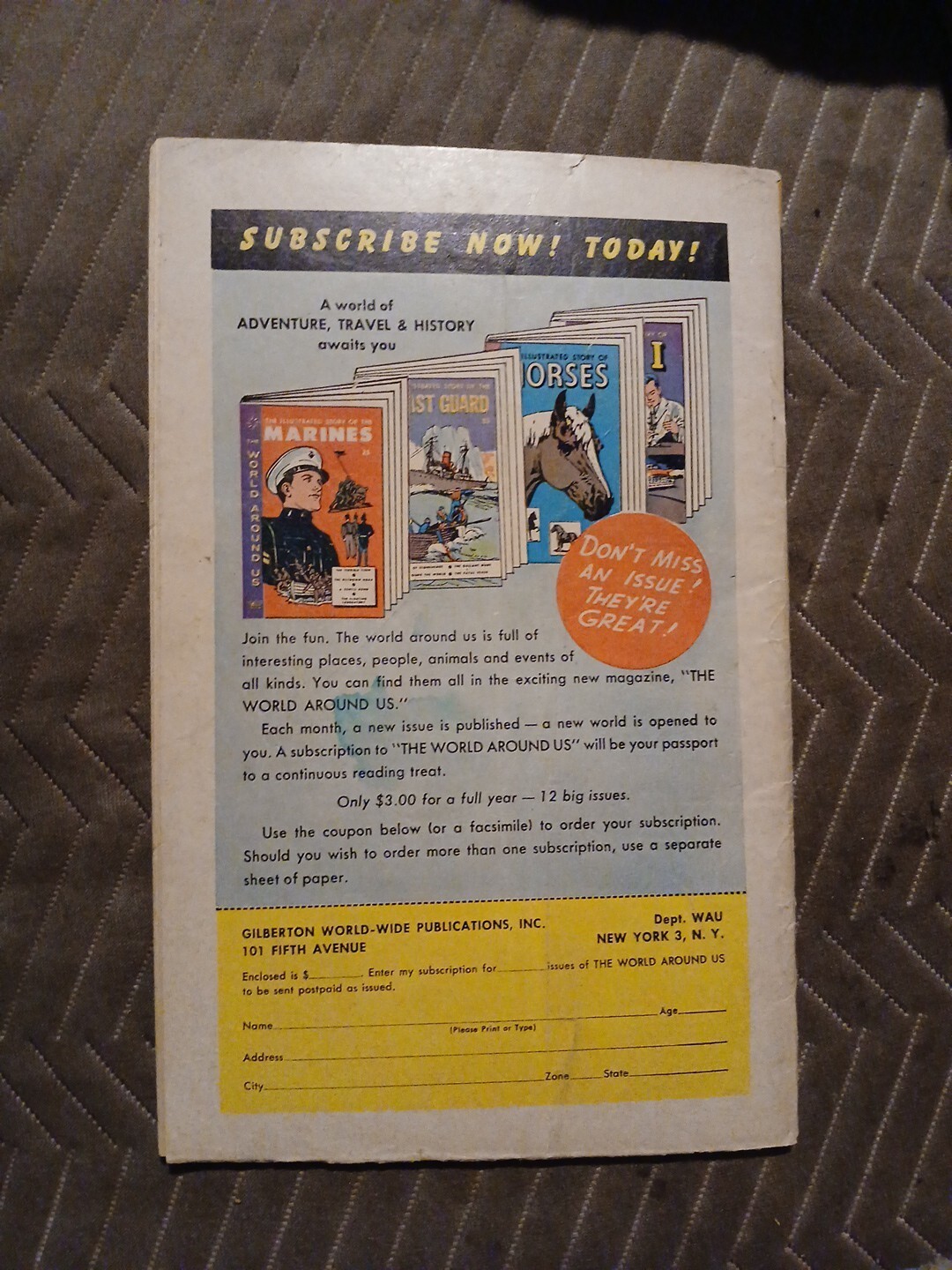 Grade: 4.0 Very Goodadd 3 items to your shopping cart and get 5$ off each when you pay for them as one order ##OFFER DOES NOT INCLUDE ITEMS WITH BEST OFFERS OR ONES WHERE I HAVE SENT YOU AN OFFER### Sadly it grades low as it has bends tears water damage and other defects. I would call it around a 4.0 vg out of 10 condition. See pics and judge for yourself before purchasing as grading is subjective. While we accept returns we do not accept returns for defects that are listed in the description or clearly visible in the pictures regardless of how big or small they are. It is your responsibility as a customer to review any information or pictures given before purchase. The grading is only our opinion and we are not responsible if you choose to have it professionally graded after it leaves our possession or interprit the grading scale differently. We conform to the Overstreet grading guide standards as they have been the gold standard for more than 50 years in the comics industry and are more strict and accurate than most professional graders as they base their grading off of overstreets original grading system. #####add 3 items to your shopping cart and get 5$ off each when you pay for them as one order ##OFFER DOES NOT INCLUDE BEST OFFERS### also as Hip now requires us to click a button that says condition and it auto applies information to our listings the information on the "condition" section should be ignored as it does not conform to comic book grading standards and is only included because Hip requires it even though it is extremely inaccurate! Check our hand typed notes on each item in the description section where we list defects and grade for each individual comic for accurate grading information. We have been selling for more than 20 years with thousands of items! Most of our Golden Age is listed as the lowest Buy It Now price on Hip and often the only copies available! We have more than 6,000 good feedback buy with confidence.