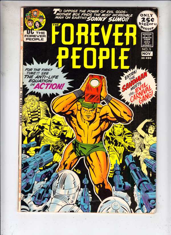 Forever People #5 - The Anti-Life Equation in Action! ARTIST - Jack "The King" Kirby APPEARANCE - Golden Age Sandman story reprint. There is a shadow on the back-spine. Characters Big Bear, Beautiful Dreamer, Ser ... Read More