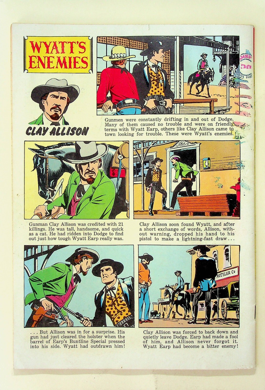 Grade: 6.5 Fine+This is a comic of Four Color No. 860 - Wyatt Earp published by Dell Comics in 1957. The grade is probably at least a Fine+ but I will leave that up to the buyer to determine from the scans.The pictures are of the actual copy being auctioned. The pages are complete and intact. The comic book has been stored bagged and boarded in a climate controlled environment in a smoke free home.If you would like more information, please feel free to ask. Please check out our other listings for more interesting items. I combine shipping whenever possible. All items are well packed and sent by USPS Ground Advantage Mail.