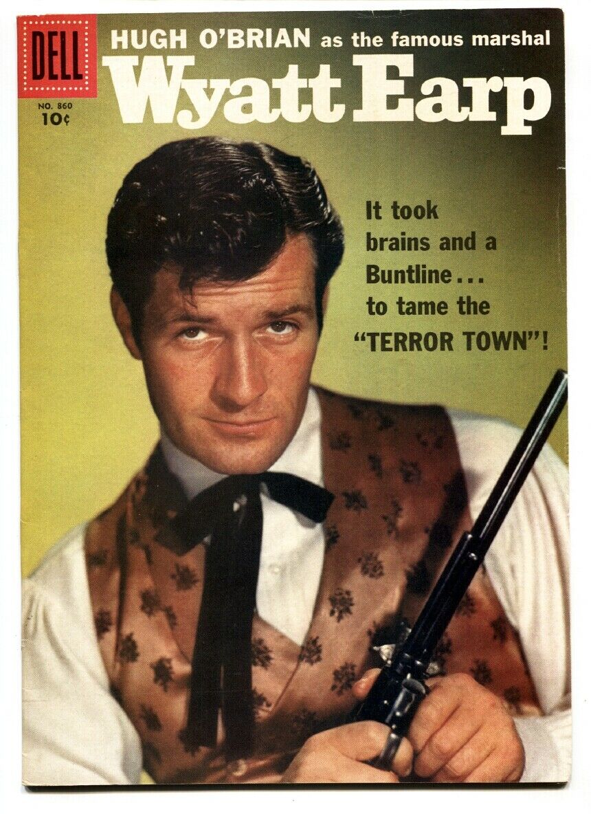 Four Color Issue: 860 / Year: 1957 Condition: VF-Wyatt Earp. Hugh O'Brian photo cover. First issue. Russ Manning art. File copy, high grade. Few tiny tears around opening edges, see scans. Publisher: DellSku: DO-41-554 Over 100,000 mail orders processed! Buy with confidence.