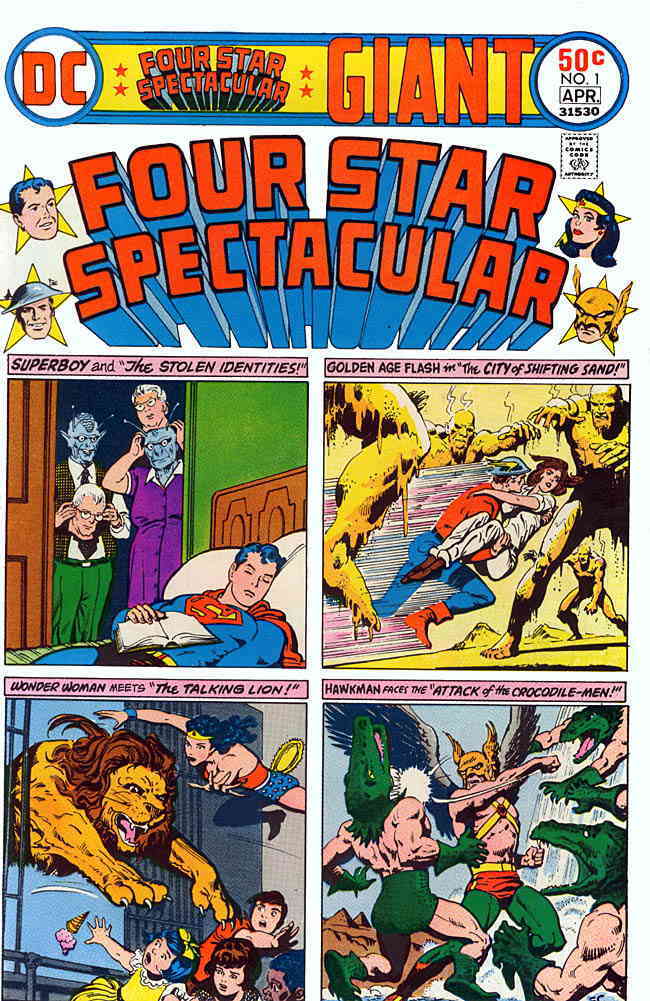 Item: Four Star Spectacular #1 | Publisher: DC | Cover Date: April 1976 | Writer: Otto Binder, Gardner Fox, William Moulton Marston, John Broome | Artist: George Papp, Frank Godwin, Edgar Bercasio, Murphy Anderson | Cover Artist: Ernie Chan | Appearances: Superboy (Clark Kent), Wonder Woman (Diana Prince), Hawkman (Katar Hol), Hawkgirl (Shiera Hall), Flash (Jay Garrick) | Storylines: Superboy: The Stolen Identities; Wonder Woman: The Talking Lion; Hawkman: Attack of the Crocodile-Men; Flash: The City of Shifting Sand | Notes: Reprints from Adventure Comics #270, Sensation Comics #17, All-Flash Comics #22, Hawkman #7 | With Economy shipping, each additional comic ships for just 50 cents more to customers in the USA. This listing contains a stock photo and information from ComicBase™ and © Human Computing. The stock photo is for reference only. If you would like to see a photo of the actual item, please message us prior to purchasing.Seller Information