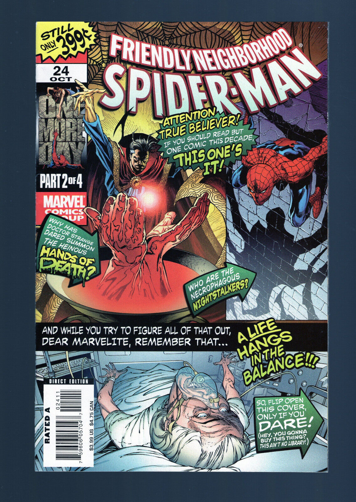 Grade: 9.2 Near Mint-Friendly Neighborhood Spider-Man #24 - Joe Quesada Cover Art. (9.2) 2007Size: 7" x 10"This item was uploaded by ___JI___.WE COMBINE SHIPPING!!! Either wait for us to send you an invoice after you commit to buy or, if it makes you pay right away, message us back and we'll refund the excess charge. Buy as many single comic books as you want for one low flat shipping rate in the United States! International will be charged exact according to size and weight. If you have any specific questions or requests, please ask us prior to ordering and we'll get back to you as soon as we can. If there are any problems with your order whatsoever, please message us before leaving feedback and we'll be happy to work with you to fix the situation! We ship worldwide, combine purchases, and charge exact shipping. The price may vary based on size, weight, and location. If you are automatically overcharged for shipping, message us and we'll be happy to revise the invoice or refund you the excess amount. If you have any questions regarding shipping, please message us. International Buyers - Please Note: Import duties, taxes, and charges are not included in the item price or shipping cost. These charges are the buyer's responsibility. Please check with your country's customs office to determine what these additional costs will be prior to bidding or buying. Payment can be made by PayPal and credit cards directly. 120,000+ items in total in my Hip store! Frequently Asked Questions: When are your operation hours?Our in office hours are Monday - Friday, 11 am - 8 pm. We are not open on weekends, so if you send us a request on Friday evening we won't get back to you until Monday afternoon. Please don't take it as us ignoring you! We will work on your request Monday and get back to you as soon as we can. Also, if you order from us on a Friday evening or Saturday morning we won't start processing your order until we open on Monday. That means on Monday it will be pulled and prepped for shipping, then picked up by the postman on Tuesday morning.When will you ship my item? The tracking hasn't moved.We realize you're eager to get your item, so if the tracking hasn't moved in a few days please don't be concerned. We give the postman a lot of packages daily, sometimes as many as 100, so he does not scan each item for us upon pickup as he says it would be too time consuming for him to do so. If you get a tracking number from us, that almost always means your item was picked up by the postman the next business day. The USPS is also imperfect. There are times when the tracking won't even show movement until it's in your area's regional distribution center. This is normal in our experience. Is the item pictured the exact one for sale?Yes! We don't use stock images and go through great lengths to scan or photograph everything we list. The item pictured is exactly what you should receive UNLESS it is a fixed price listing with multiple items available. Can you issue a COA? We can, upon request. Please make sure you leave us a note while checking out and shoot us a message immediately after requesting one, just to be sure. How do you grade?Grading is very subjective, but we are professionals with decades of grading experience between us who try the best we can to accurately describe the condition of the items we list. Anthony is an Overstreet Comic Book Price Guide Advisor Please see the grading chart below for a breakdown of how we grade: NOTE: We don't grade any raw books higher than 9.2, as once you go higher than that grading gets really subjective. If you buy a NM book from us, it may very well be higher than 9.2 but we play it safe and grade conservatively. 9.2 NM Near Mint 9.0 VF/NM Very Fine/Near Mint 8.5 VF+ Very Fine+ 8.0 VF Very Fine 7.5 VF- Very Fine- 7.0 FN/VF Fine/Very Fine 6.5 FN+ Fine+ 6.0 FN Fine 5.5 FN- Fine- 5.0 VG/FN Very Good/Fine 4.5 VG+ Very Good+ 4.0 VG Very Good 3.5 VG- Very Good- 3.0 GD/VG Good/Very Good 2.5 GD+ Good+ 2.0 GD Good 1.8 GD- Good- 1.5 FR/GD Fair/Good 1.0 FR Fair 0.5 PR PoorHow do you ship comics? We ship in rigid cardboard mailers to protect your comic book from the worst the mail system has to offer. Price varies based on the number of books you purchase, but we try to keep costs as low as we can and charge exact shipping. If it looks unusually high to you please send us a message and we'll be happy to double check for you. Do you combine shipping? Yes, of like items. Such as: several comics can fit in one cardboard mailer, as can more than one record. Multiple art pages can easily be combined because they are light and thin. Where combined shipping differs is with size and weight. For instance, two statues require a much bigger box. Same goes for CGCs, as the package gets bigger and heavier as you go. Do you ship well? I've had some bad experiences... You needn't worry; we are professionals who value your business and want your item to arrive safely as much as you do. I have been collecting for over 30 years. I send out items the way I would like to receive them. The tracking says my item is "OUT FOR DELIVERY" in New Jersey. Why is that?If the tracking indicates that the item is "OUT FOR DELIVERY" in NJ don't worry, it's just what the tracking says when it's carried over from the postman to the sorting center. This is normal for our Post Office and will not impact you receiving your item in a timely matter.What is the difference between a RUN and a LOT?Good question. A RUN will be a collection of consecutive issues with no breaks in between them. If it says RUN of #s 1 - 50 you will receive 50 consecutive comics. A LOT will be within a certain range, so a 50pc LOT will not contain consecutive books.I changed my mind after successfully winning the auction or fixed price listing, will you cancel the transaction? Please only bid or hit BUY IT NOW if you are willing to follow through and pay for the item, we will not cancel the transaction. As a seller, Hip penalizes us ev