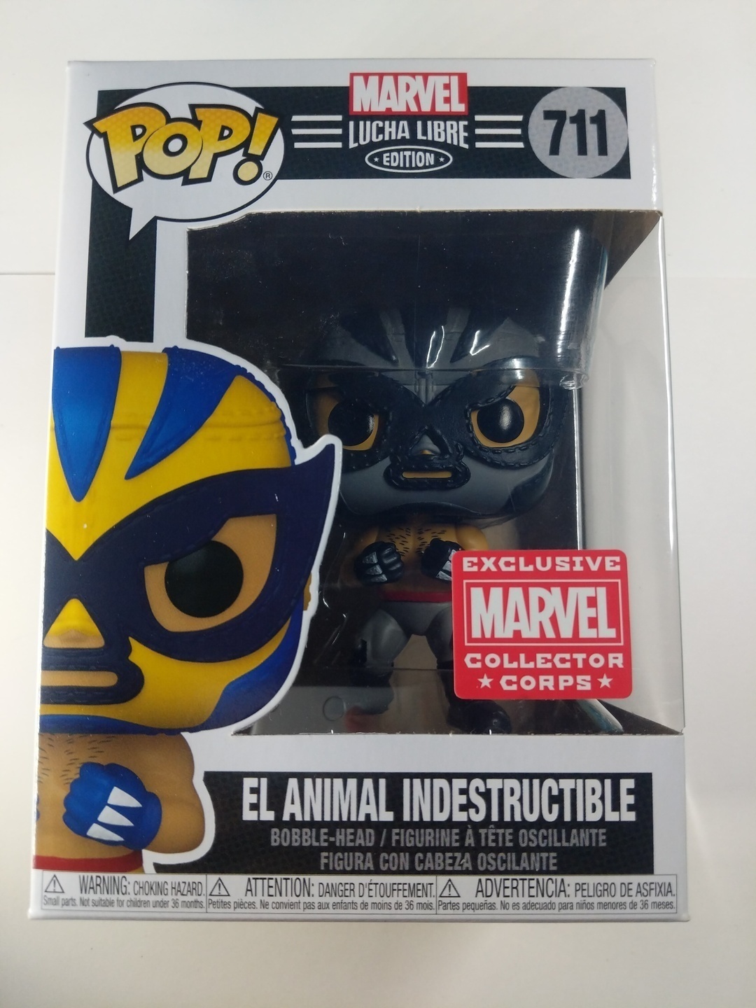 This Funko Pop! figure features El Animal Indestructible in a unique Marvel Lucha Libre Edition style. It includes an exclusive Marvel Collector Corps sticker, adding to its collectible value. The character combines classic superhero elements with Mexican wrestling culture, making it a must-have for fans of both genres.