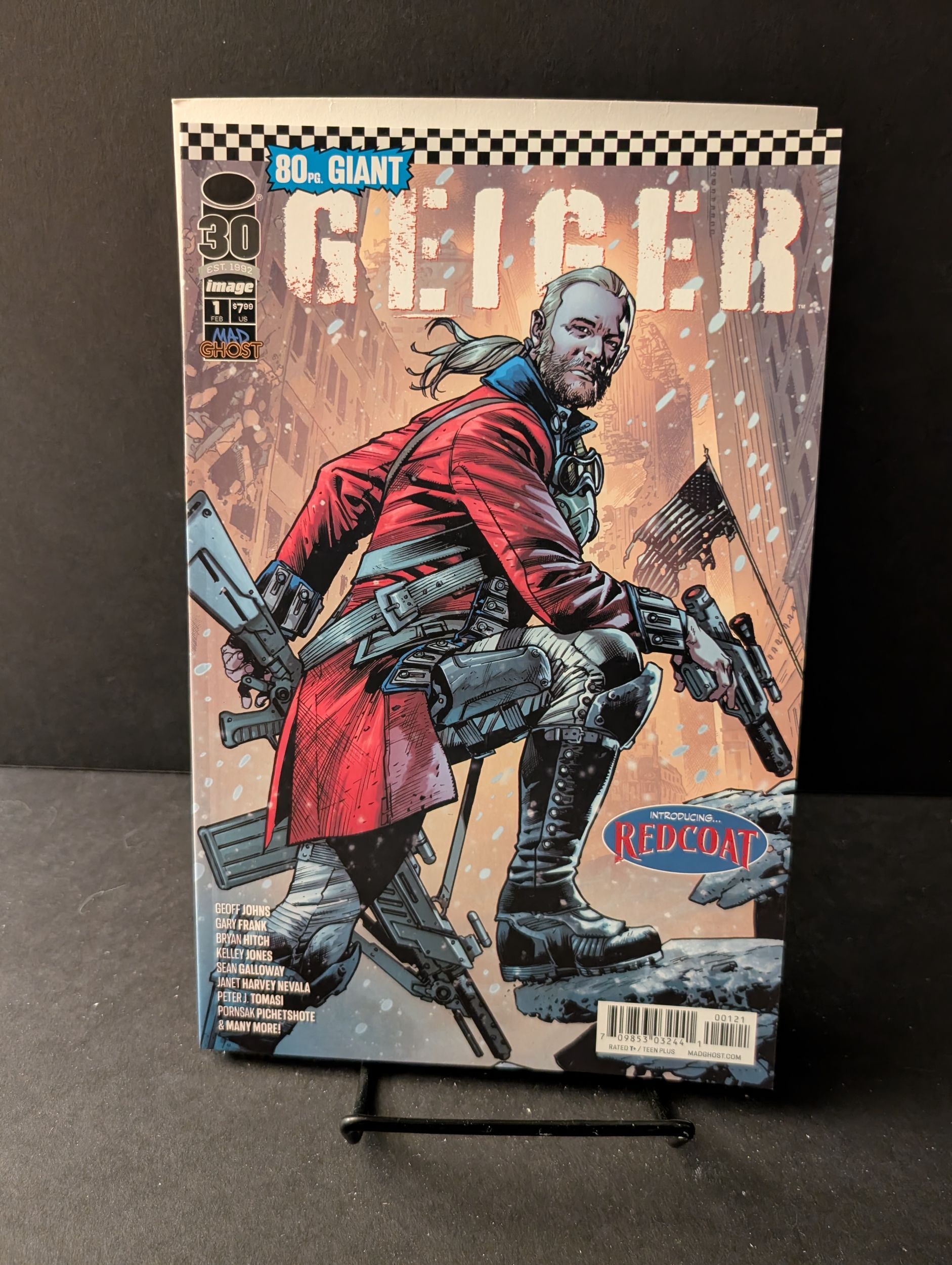 Cover by Bryan Hitch. Written by Geoff Johns, Peter J. Tomasi, Sterling Gates, Leon Hendrix III, Pornsak Pichetshote, Janet Harvey Nevala and Jay Faerber. Art by Bryan Hitch, Gary Frank, Paul Pelletier, Peter Snejbjerg, Kelley Jones, Staz Johnson, Sean Galloway, Megan Levens, Joe Prado, Tony Kordos and Rosa La Barbera. MAD GHOST COMICS presents a MONSTROUS 80 PAGES of all-new stories featuring GEIGER, as well as his allies and enemies! First, in the extra-sized lead story "Who Is Redcoat?", Geoff Johns and Bryan Hitch introduce the mysterious man known as REDCOAT and reveal his bizarre ties to the American Revolution, the Unknown War, and Geiger himself. Then, the special origin tale of Geiger's favorite two-headed dog, BARNEY, in "Where'd He Find Barney?" by Geoff Johns and Gary Frank. Also, "Tales of the Unknown War" and "What About the Shooting Star?" by Geoff Johns, Paul Pelletier and Tony Kordos. Plus, discover the secrets of the Warlords of Las Vegas -- Bonnie Borden! Goldbeard! Mr. Karloff! And more! -- in a series of tales written and drawn by some of the greatest writers and artists today: "The Safari" by Peter J. Tomasi and Peter Snejbjerg; "The Karloff" by Sterling Gates and Kelley Jones; "Nero's" by Leon Hendrix III and Staz Johnson; "Goldbeard's" by Pornsak Pichetshote, Sean Galloway and Rosa La Barbera; "The Manhattan" by Janet Harvey Nevala and Megan Levens; and "Saturn 7" by Jay Faerber and Joe Prado. And special features: "The Unnamed," plus "Junkyard Joe First Look" at Geoff Johns and Gary Frank's new upcoming series! 80 pages, full color. Rated T+ Cover price $7.99.Seller Information