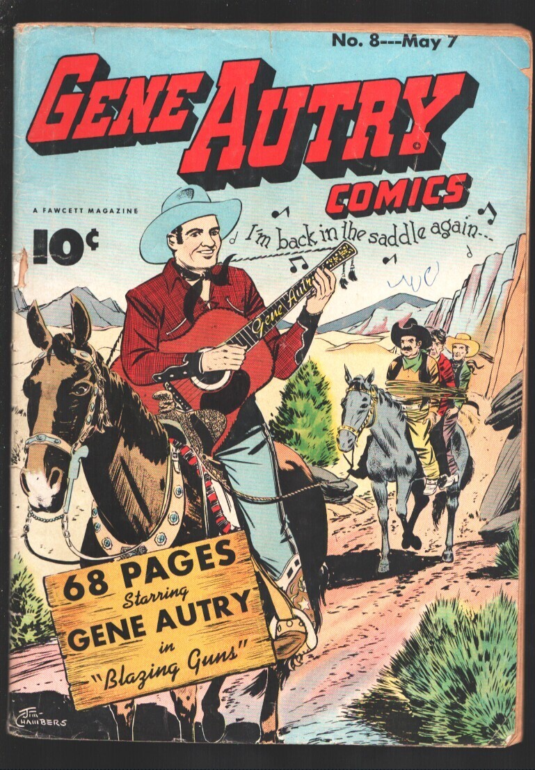 Grade: GGene Autry #8 1943-Fawcett-Jim Chambers cover art-Gene with guitar on cover "Back in the Saddle Again"-G -Jim Chambers cover art -Gene with guitar on cover "Back in the Saddle Again" -Promo page lists Gene's 8 most recent films from Republic Pictures Grade: G SKU: EB-05-038