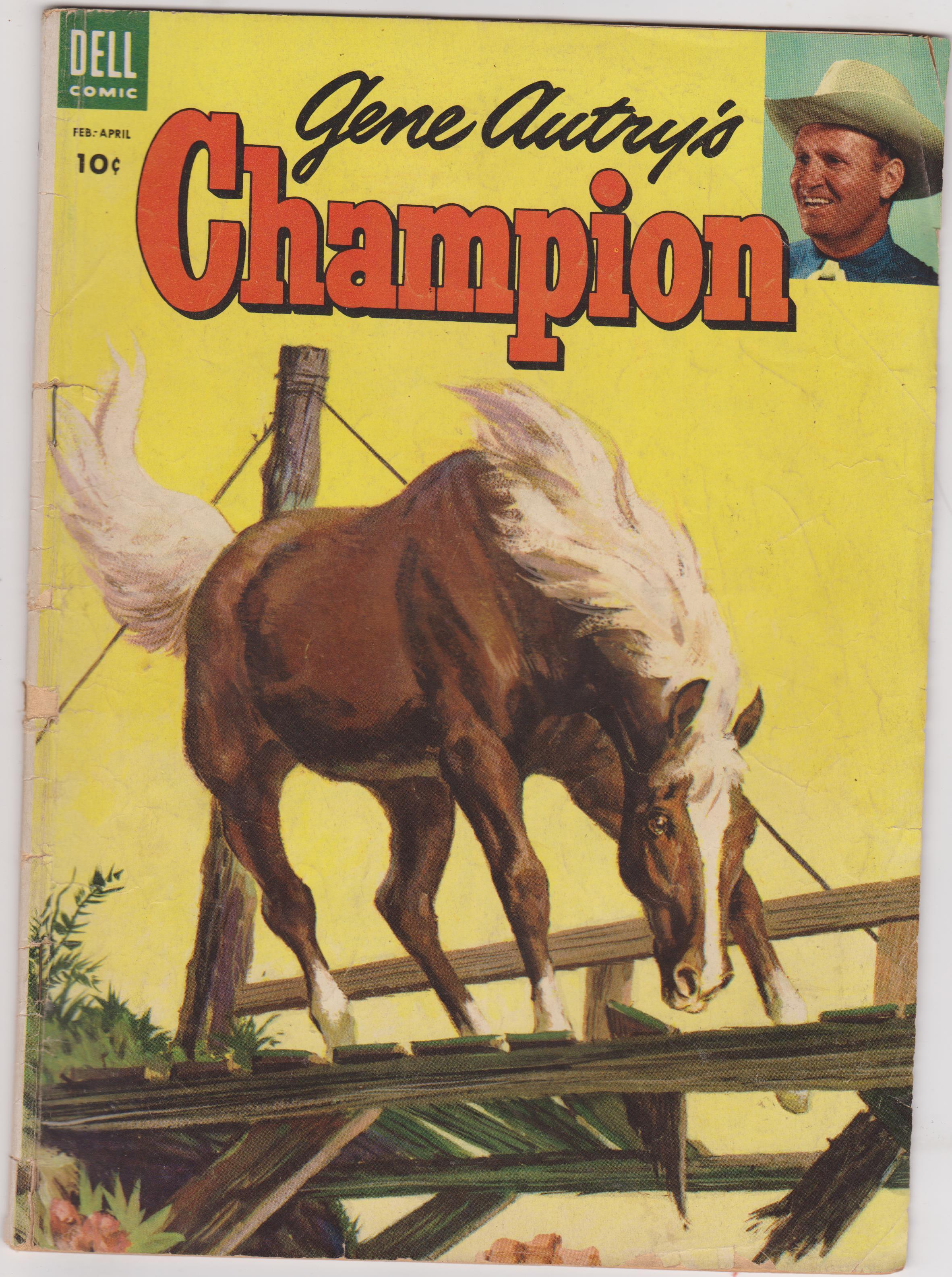 Gene Autry's Champion #13 by Marvel Comics copyright 1954. I have graded the comic book, using the Overstreet Grading Guide, at GOOD with the following defects: Light stress marks along the spine. Piece missing from the spine. The corners are rounded. Folds in the upper and lower right corners. Wrinkles through out the cover. There is yellowing of the pages.Seller Information