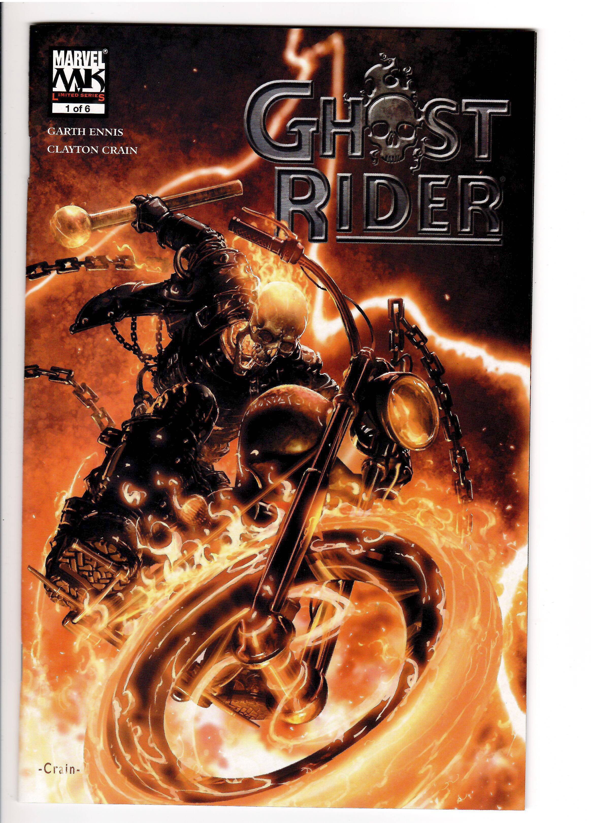 Ghost Rider 2005 limited series;Ennis and Crain;This series had a low print run and is one of the 16 year old series that is often not seen in 1-6 series.This is a complete series in unread high grade.This is the only run we have for sale.We have reviewed this under HIGH MAGNIFICATION.These are flat,tight copies,unrestored that we feel are graded accurately.